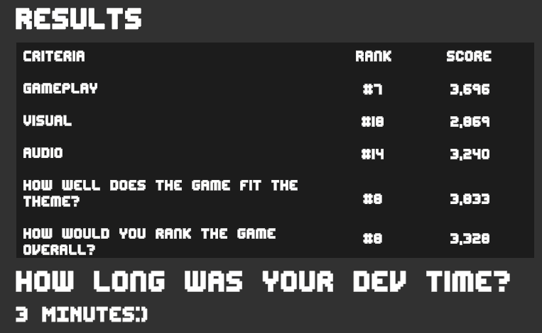 I think for the rating screen I will have a better implementation for the theme score & better balance overall(since currently 1st place requires ~250 on every single minigame). I don’t have time to play games in the next few days, but I will check your newest game again after the update!