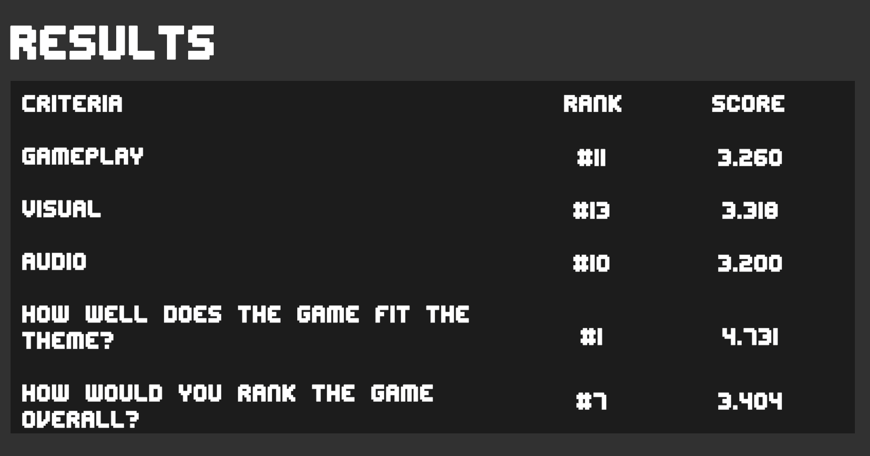 The theme minigame was fun and unexpected. Having the full jam experience including the design and upload phase, and most importantly the rating, really completes things. I'll take 7th place!