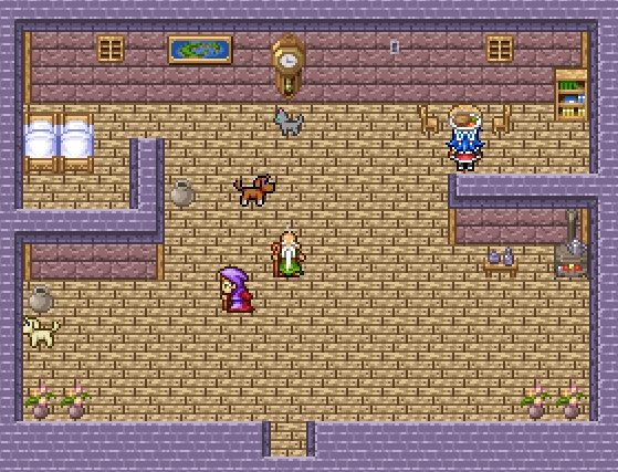 I found the graphics overall appealing. I am not sure how much if any art is original vs. how much is stock RPG Maker, but this is more the era and style of what I think RPG Maker should look like. I find the newer 32-bit-ish RPG Maker graphics distasteful, so I'm glad you stuck with the classic look. The player combat sprites in particular are charismatic and cute. The anti-aliased portraits do feel a little mismatched against the sharper pixels on the field screen (that may be RPG Maker's fault), but this isn't a big deal. I did recognize some of the music tracks, which I don't think I've heard in the 25+ years since I was playing with RPG Maker 95, so that was a nice bit of unexpected nostalgia.