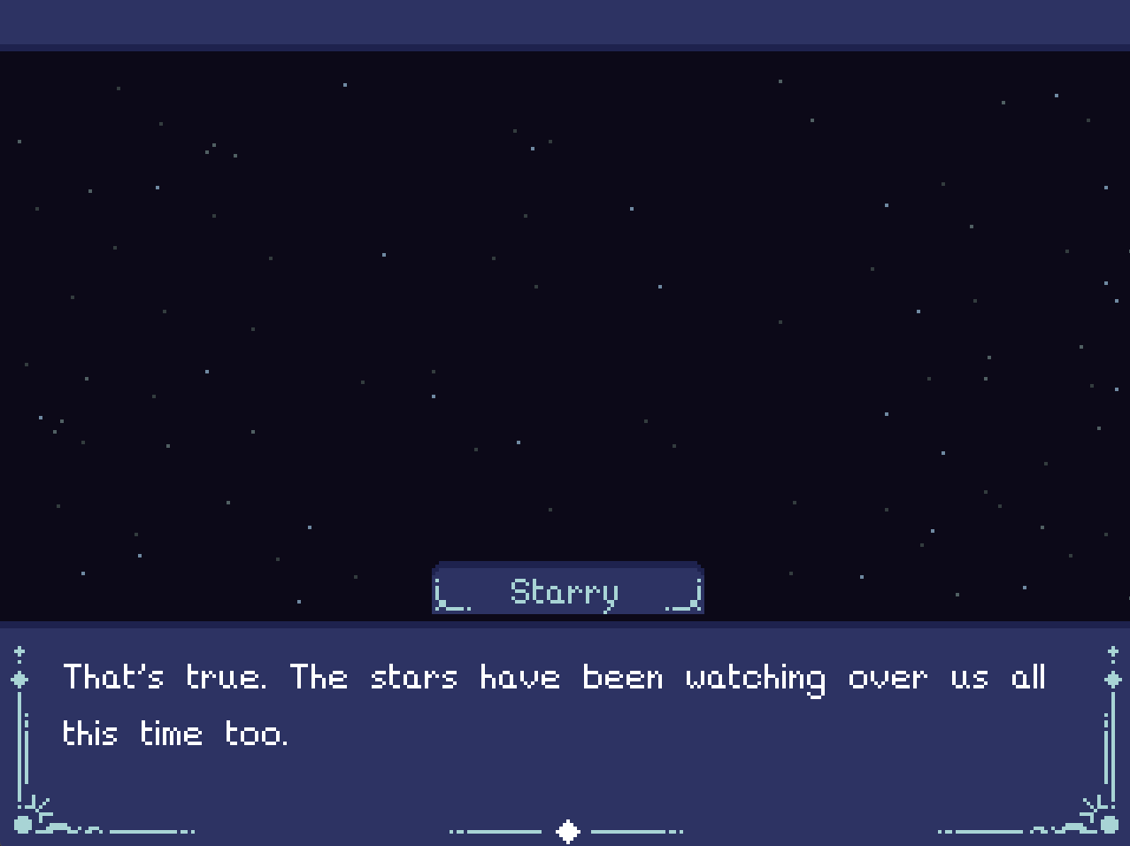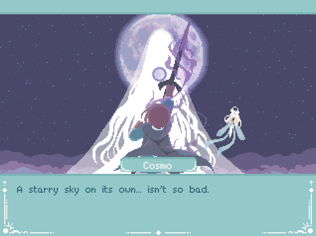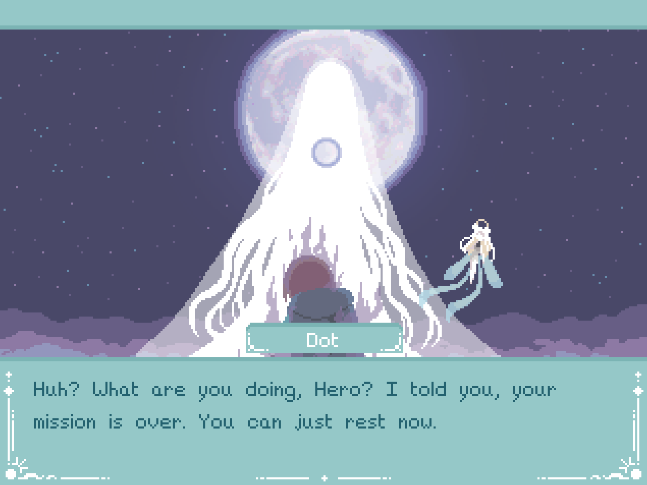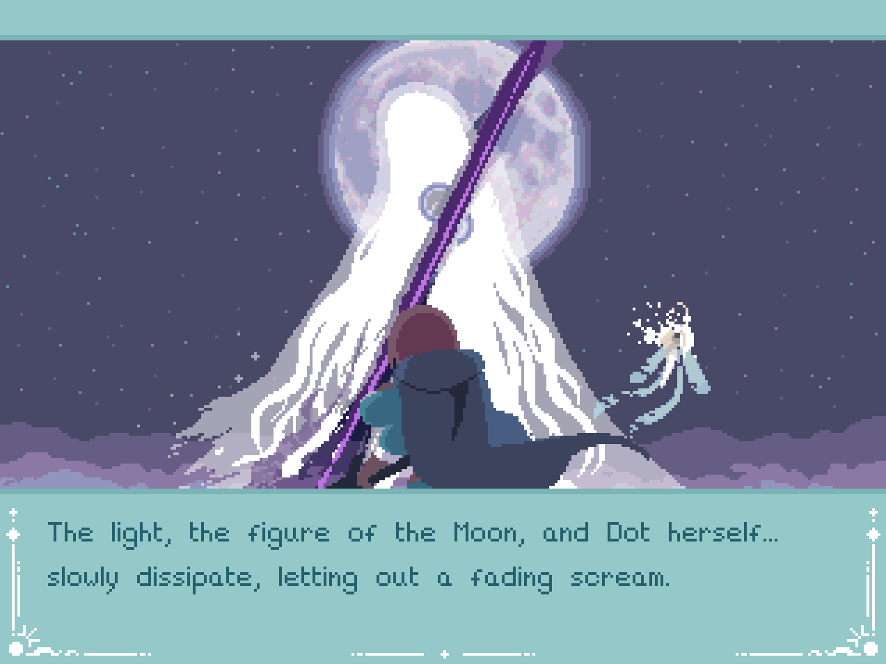 At first, I got the ending wherein I became the Moon, but felt that something was definitely off. Especially with the way Dot described the Moon God after we had been discussing its sacredness the whole journey. I picked the characters' names based off of myself and my fictional self-insert OC's soulmate and this part was super poetic... I know the characters in this narrative are friends btw, just to clarify.