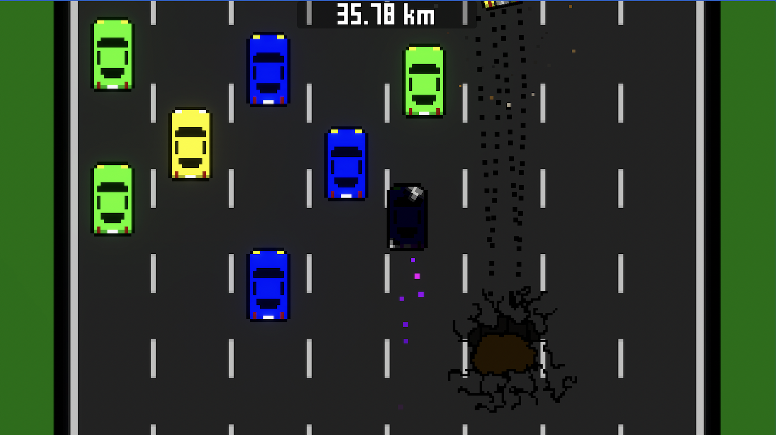 Unimportant bug: I got the faster upgrade while I was in ghost mode or reverse, I forget which, but the sprite changeover didn't go right and I ended up with a black car. Which I didn't mind cuz I look cool, especially when maintaining a bit of damage for cool visual texture and extra challenge.