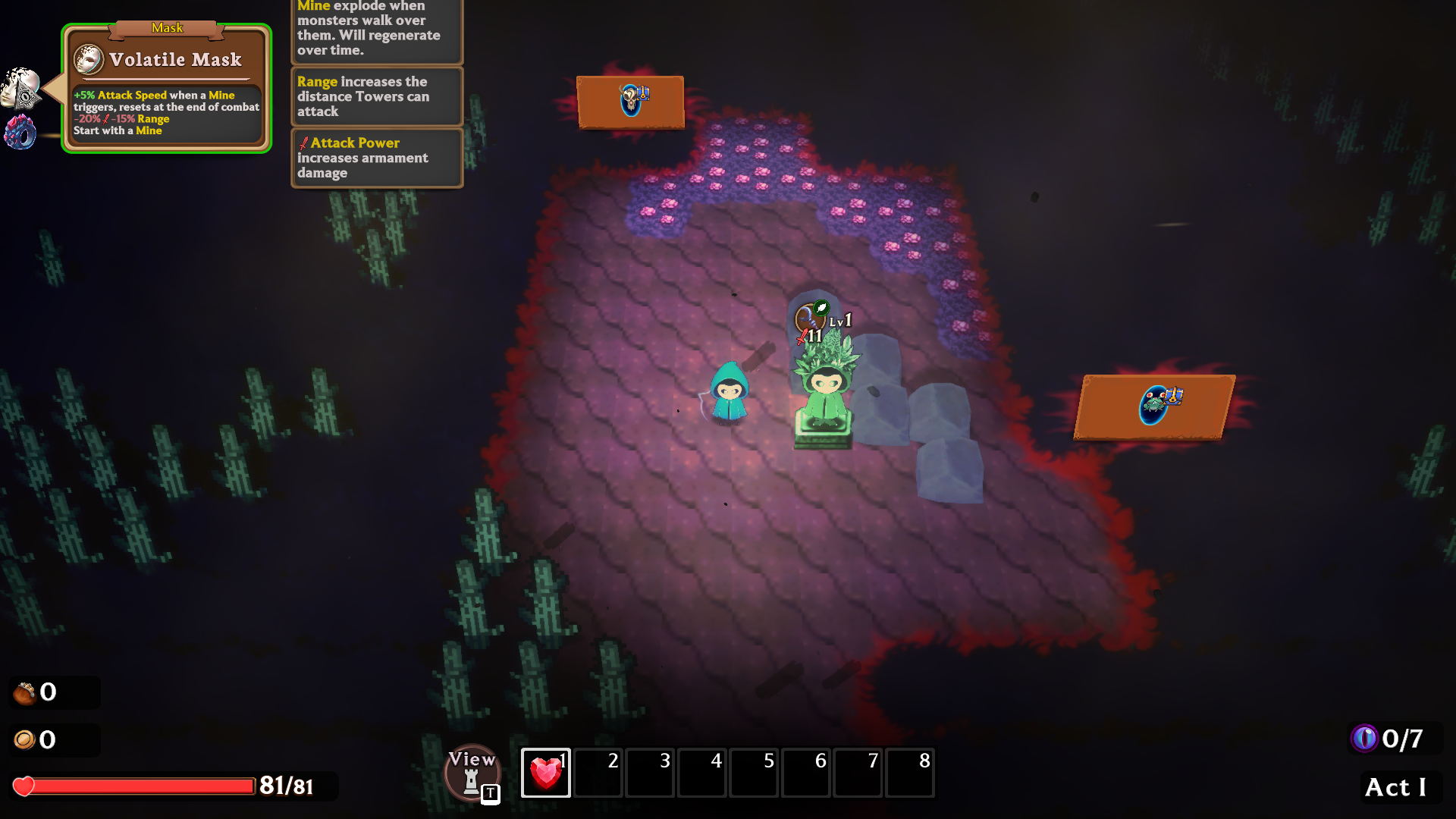 This bug also works with the +1 Health Globe from the Stillness Mask, which in turn can break things like the Heart Striker tower, the Blood Tentacle relic, and the Bloodrush Idol relic (which then furthers on to break anything that gains from move speed). I have a Heart Striker tower with 1931 damage and I have 767% move speed; it's so fast that I can run around the entire field in less than three seconds. It's also so fast that it becomes very hard to control, leading me to focus on getting picks to remove obstacles and to design my base to make moving around easy.