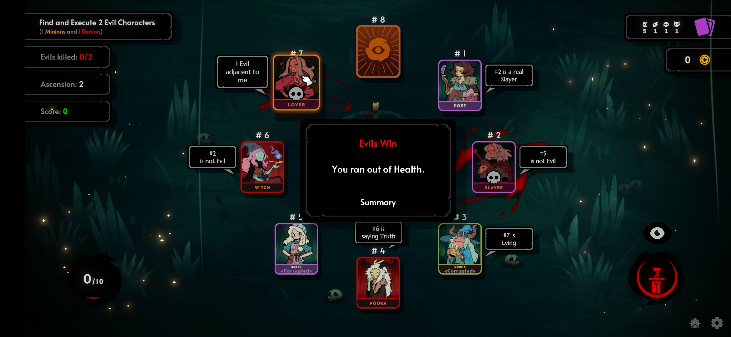 Great game, however I think there's a bug in this particular round. I killed #2, a real slayer (whoopsies) and got the next one wrong. However once revealed, the Witch at #6 truthfully says the slayer at #2 is not evil, and the Pooka at #4 truthfully agrees... how is this possible where both evils would need to lie?