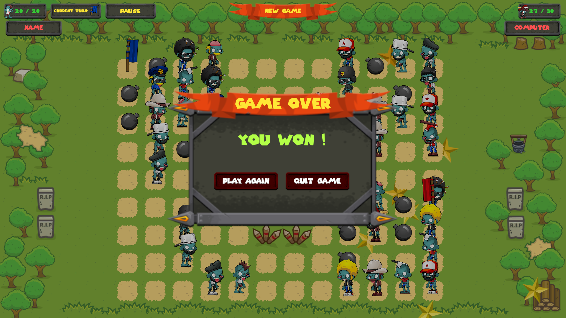 Very nice looking game, it was easy enough to beat - I just used the strongest zombies and hoped they didn't step on the bombs! I had a few issues on the army placement though. At first I was able to place them where I wanted but after a few it no longer allowed me to move them so not sure what was going on there. If the zombies have special abilities a mouseover tooltip or help screen would be very useful. I think you could definitely expand on this game, it's got great potential!