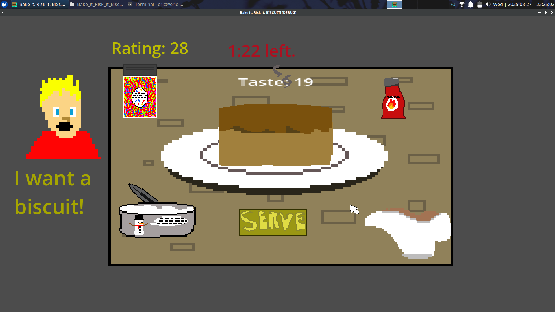 I am actually making a game where the player gathers food ingredients and my plan was, if time allows, to have different characters prefer different ingredients the player gathers and give a score accordingly. You could implement similar system perhaps; now you only have that one yellow haired guy but you could have different guys and gals with various hair and clothe colors and have them judge biscuits each differently, but consistently as per character. Just an idea...
