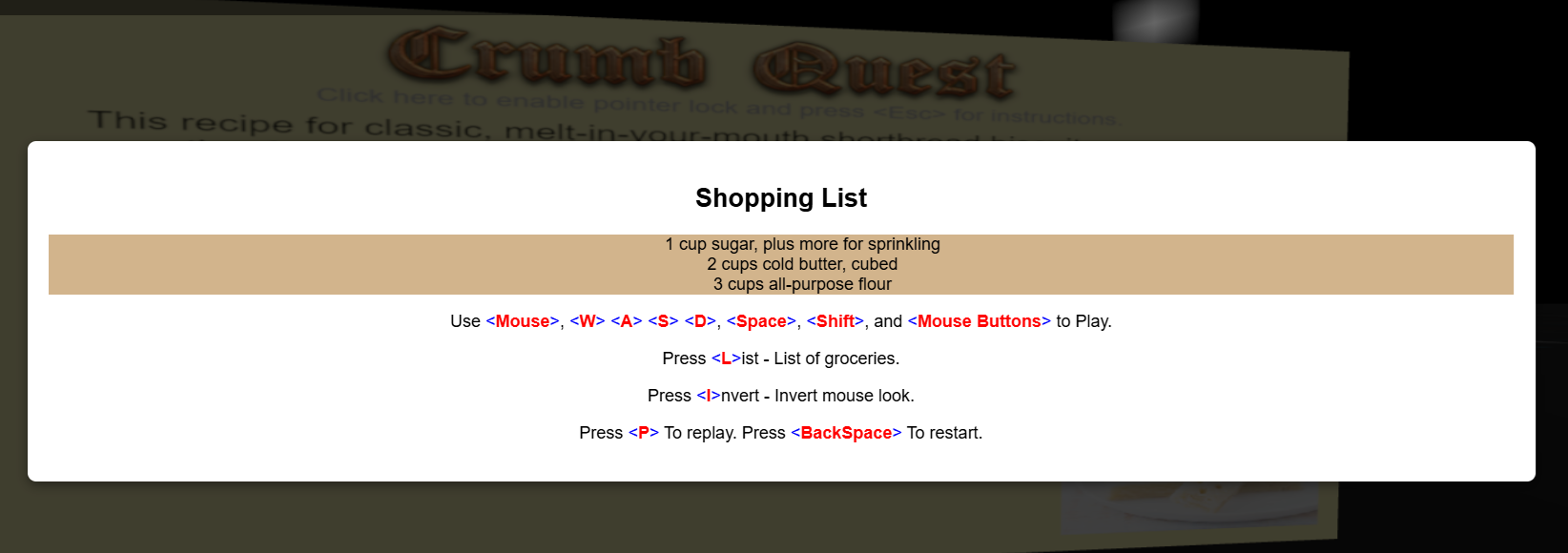 There is a bug where if you hold space then all of your jumps get drained. And I think you should change the keybind for checking the ingredients you need, because pressing escape unlocks the mouse.