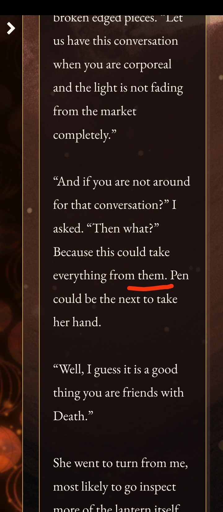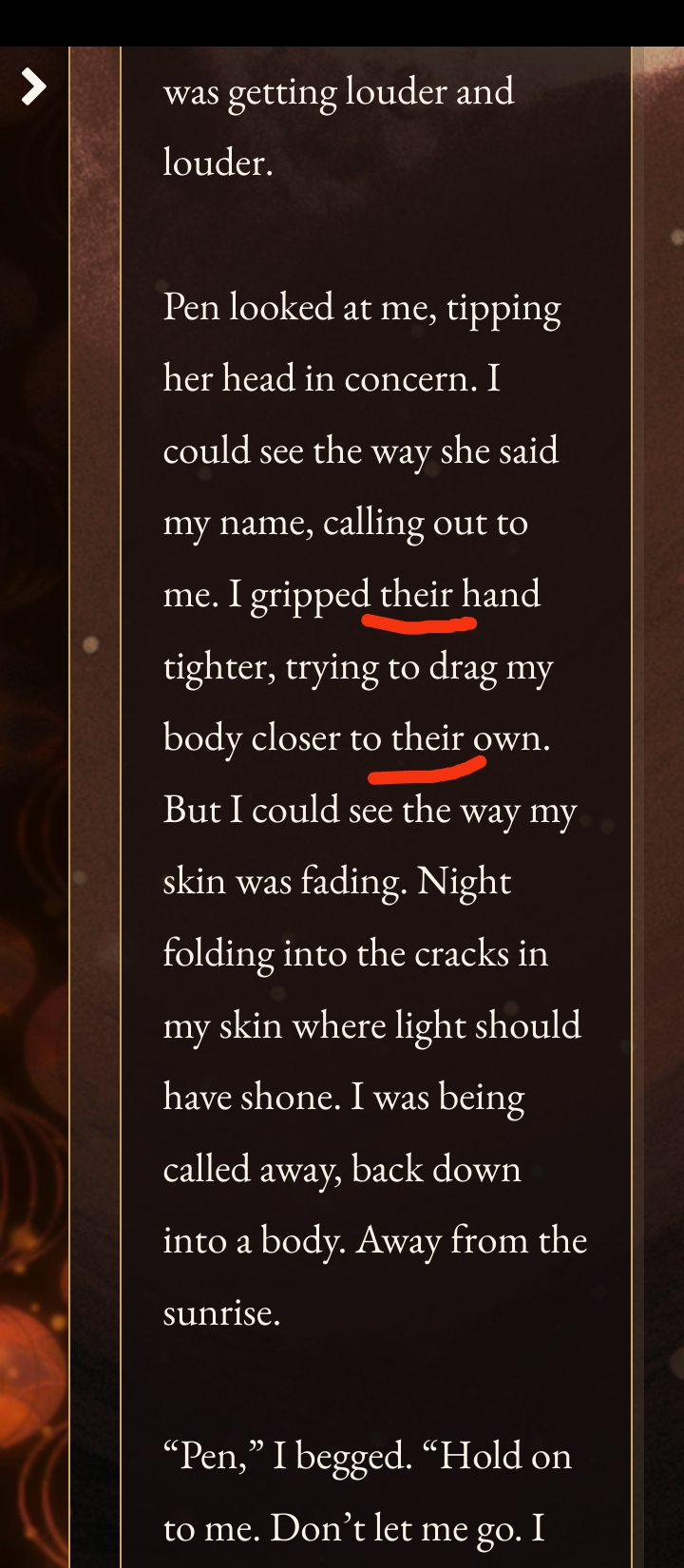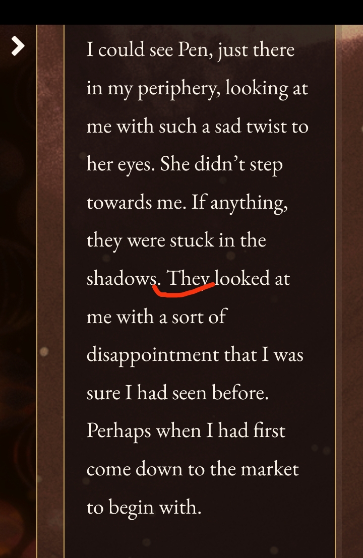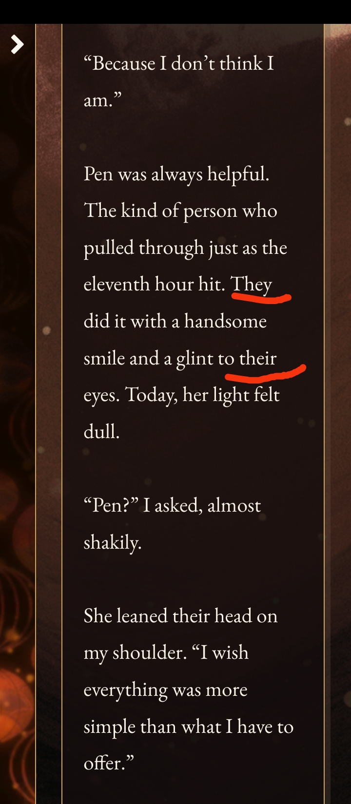 And in chapter 8 the Pen's pronounces constantly change between their chosen ones and they/them: