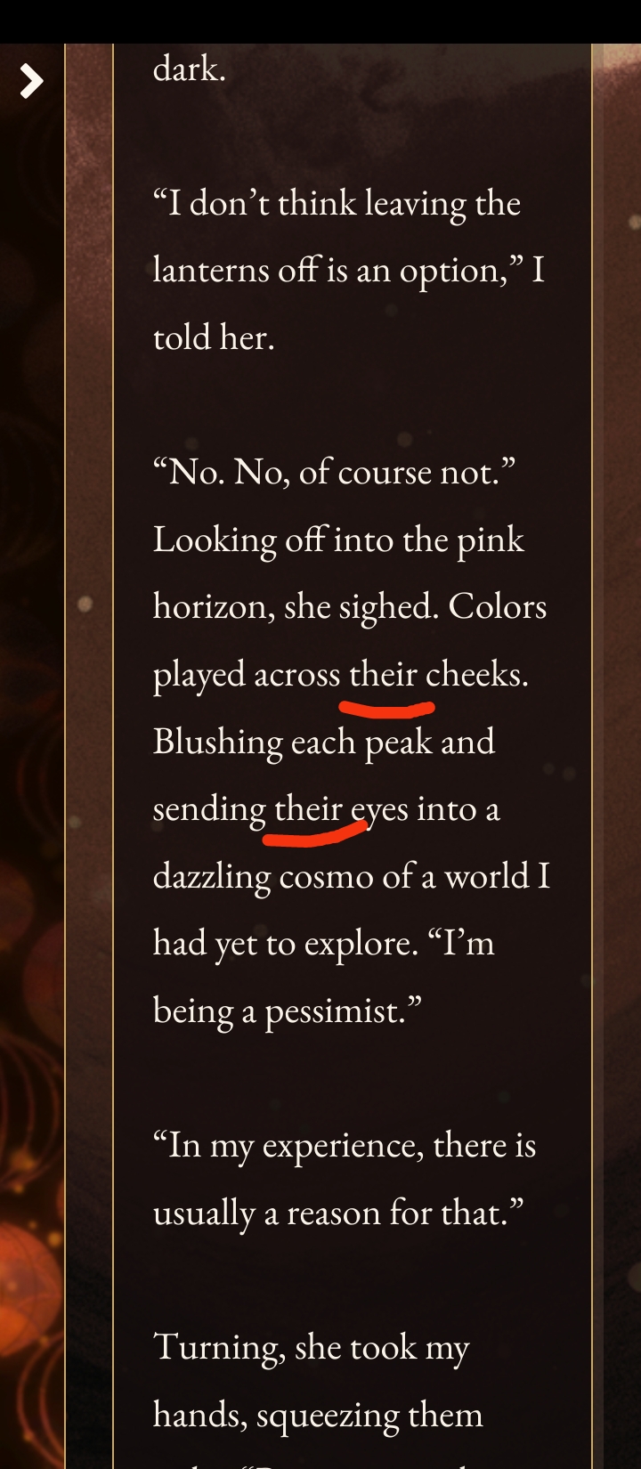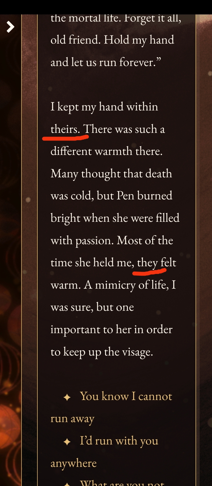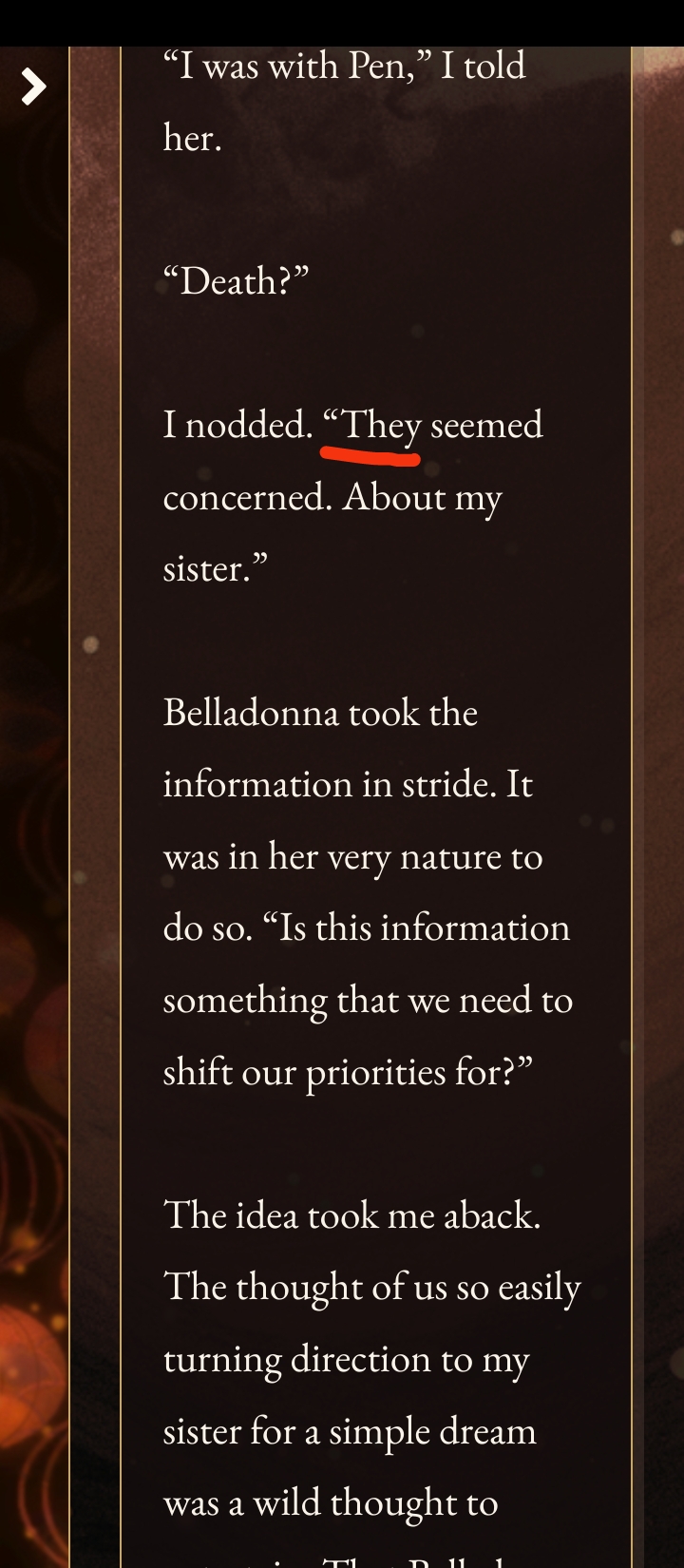 And in chapter 8 the Pen's pronounces constantly change between their chosen ones and they/them: