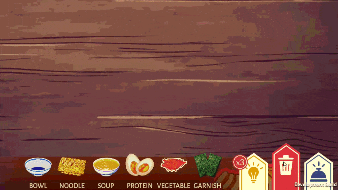 A visual bug is if you put the bowl to the far edge of the table near the customer, it renders on the left panel, but the bowl is not visible, only the noodles and topping:
