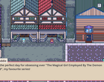 The world-building in this game is great! I enjoyed learning about the The Magical Girl Employed By The Demon Lord series through descriptions of the merchandise and charming interactions with the NPCs in the town. I appreciate the controls in the description because I was confused that buttons in the UI didn't correspond with letter keys (maybe it can detect if a controller is plugged in and change the UI in response?). The beginning scene transition was fantastic!