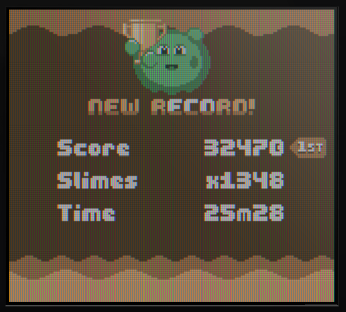 When (and if) this gets corrected, my highest score has x1807 slimes cleared, 33m15s, and score of around ~40,000.
