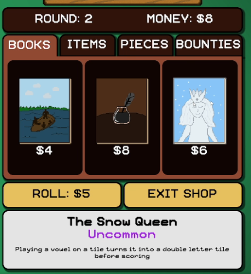 Hey, thanks for playing and thanks for the stream! I could try to add a sticker pack item that scatters random stickers. I'm not sure which book you mean by the book that swaps out vowels for double letters, maybe I wasn't clear on my wording in a description, but there isn't a book that does that. Also the books that give points are effected by the multipliers, maybe I should make that more clear. The general sentiment is that the easy bounties are too hard, I could tone them down a bit, too. I could add a "dictionary" feature, but the word list is hundreds of thousands of words long... I use a set to store it so looking them up is quick though, maybe I could add something in game to check if a word is real. Anyways, thank you so much for playing and I'm glad you had fun!