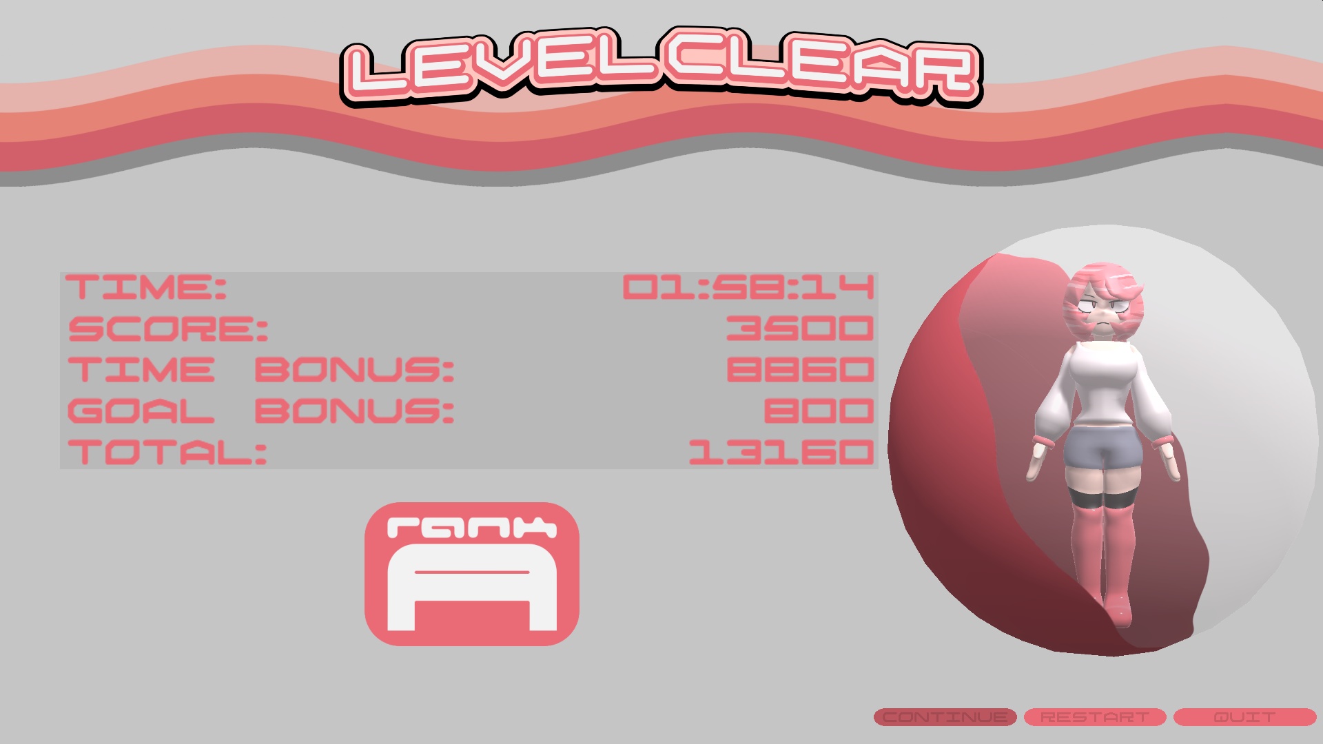Menu seems off. Selection getting so bright feels like it's locked, I'd recommend having two distinct colors. Jumping through the hoops seems to do nothing but turns out they give you points. It'd be nice to have points floating upward after clearing it, maybe even for killing single enemies, not only for doing multikills. I really liked the planetary level, I was tring to beat it the longest time. Those saturn rings being part of the level were cool. First level being just gray checkerboard is not. Also you have only four set positions for the camera and at some point you introduced thin paths with 45 degrees turns? Not cool. Overall, ease up with the difficulty! Maybe add tiny little ramps at the edges so it's harder to fall? At hte end I thought I was doing very well but one small mistake and I was falling down the infinite void anyway.