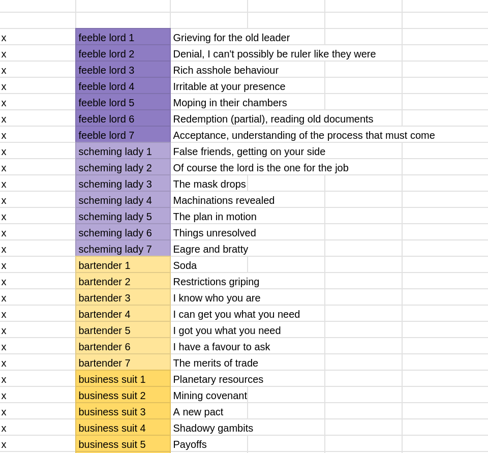 I also make use of spreadsheets to hash out narrative structure, which this time was relatively plain which I'm a little disappointed with but it worked well for this project.