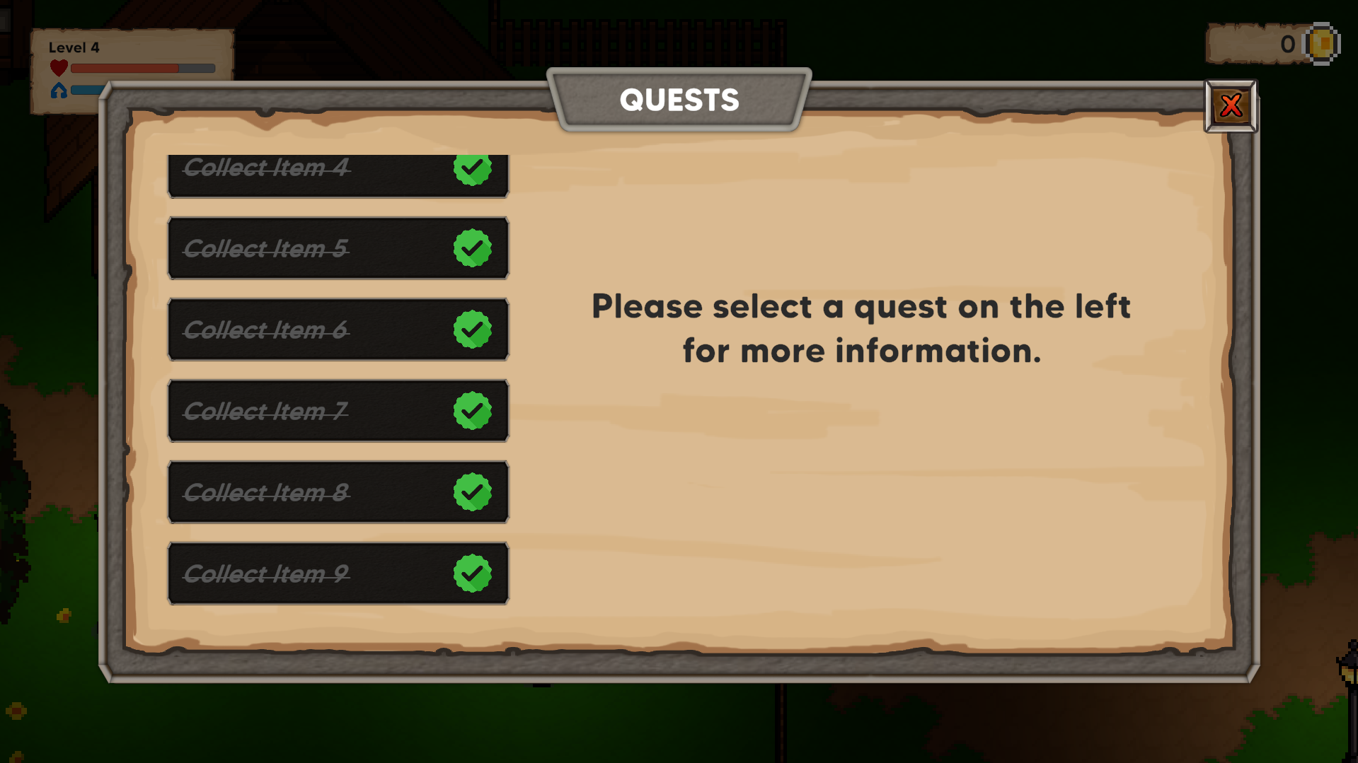Really solid game, in a week jam to do this amount of systems is really cool, I liked all of them: upgrades, shop, quests, combat, etc. I have beated all the quests of the game, your game is really fun. My problems are only 3: