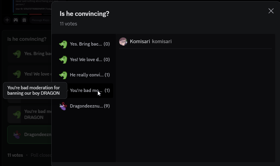None of that is really relevant anyways. While it's true the options presented were silly and lighthearted, you still had bothered the community enough to have 9 no votes and 1 joking yes vote aside from Komi. One member said they had even started reporting your account entirely, weeks before the ban, and I had personally received some concerning comments on my personal socials from a Dante hours after your ban. You made a net negative impact on the community and its people.