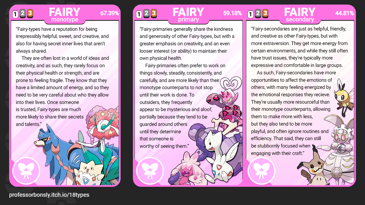 Primary: 1;Fairy (59,18%) 2; Phychic (30.23%) 3; Normal (20,34%)