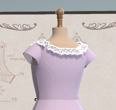 The lace is a very nice addition! Though it was a bit awkward to apply up at the neckline because the viewing angle made it hard to pin in the right place. (Even with zoom) Is  there a graphical limit to how much the mannequin can pivot? Though I'm wondering if it's possible for lace to be applied at the sewing stage? (Maybe if lace at the sewing stage was in fixed locations, but optional decorative lace could be applied at the accessories stage?)