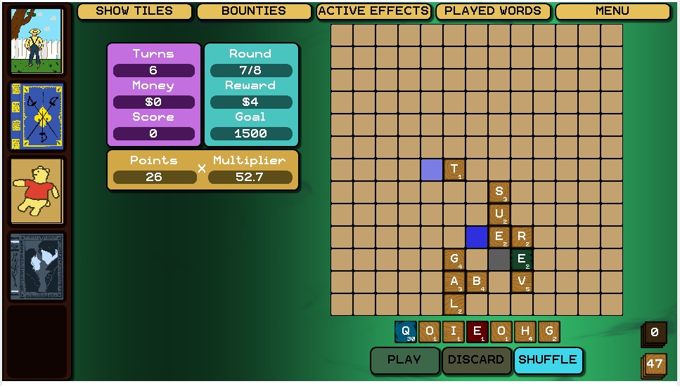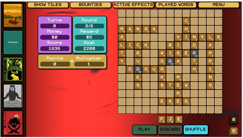 I bought a bunch of books, claimed two bounties, got plenty of runes. It's possible to miss the bounty claim, as there's no indication that requirements have been met. I'm pretty sure it happened to me once. Also I wish there's a possibility to buy stuff during the play, not only when finishing a round. The strategy I followed was pretty easy - buy as many books as possible, look at possible word that can have couple of ways to expand and increase both the board tile and a letter tile. I thought that 'Leviathan' book should be OP but it was just adding 50 or so points (they're not multiplied, right?) when my goal is 2500, it's almost worthless later on. Now having three musketeers, Wizard of Oz and those bonuses for horizontal and vertical were acumulating points on their own, I don't even know how. Maybe there's a better way to telegraph how bonuses are being given, flashing book and number-go-up is nice but I felt almost too oblivious to what's happening. That one purple bonus, I don't know what it does? What does it mean he gets triggered again?