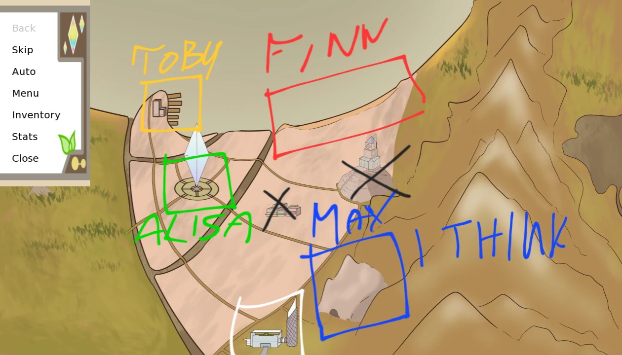 These are all the clickable places I could go, I thought of sending this, maybe it can help. :D If it's still not works, then I can either screen this and send it to the dc server if you are not in, so maybe others can suggest something or you can still delete and re-download the game? I usually just skip to choices when it comes to that so I don't have to replay it entirely :D