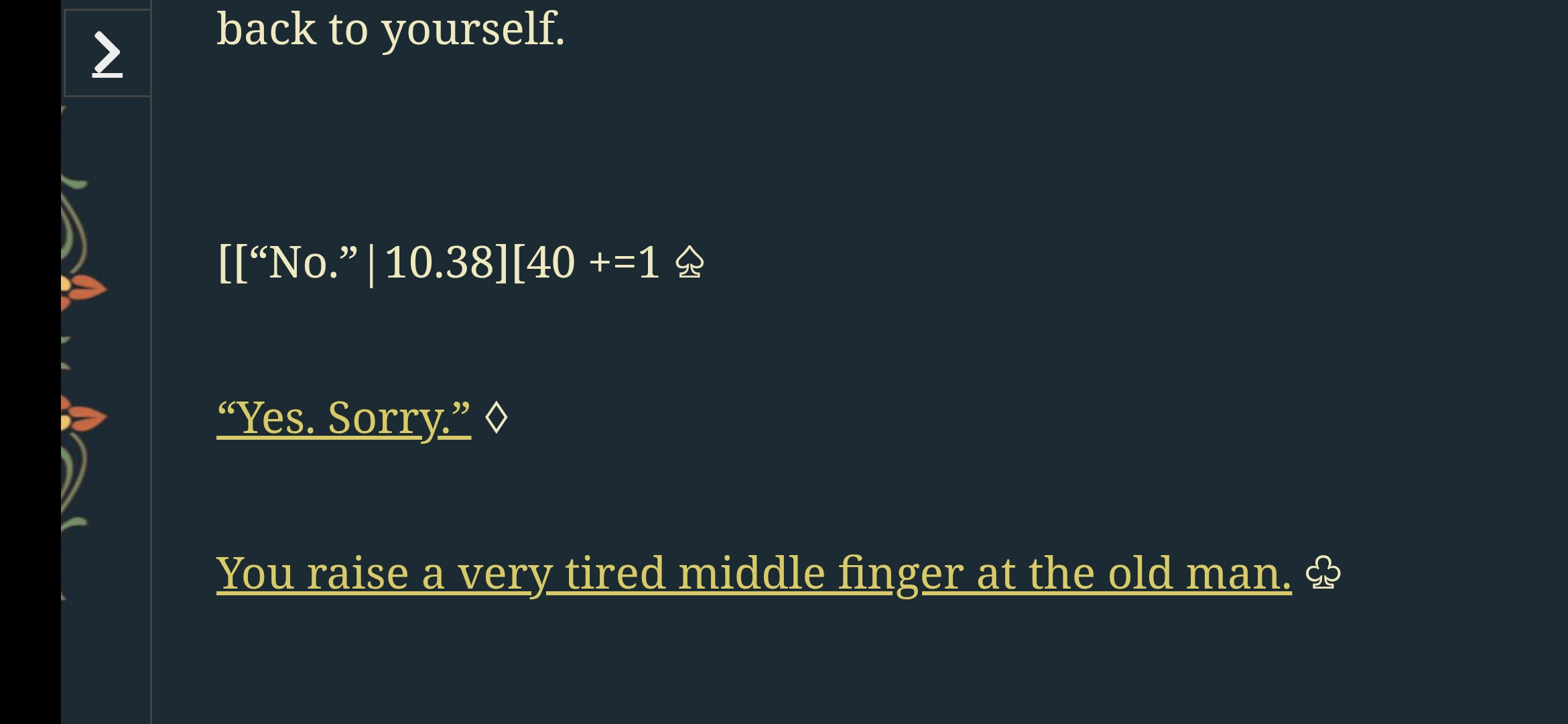 Found a bug. In chapter 10, upon waking up after the inciting incident for the chapter, the spade option is bugged out in this dialogue option. I think it's just missing 2 closed square brackets near the end of the spade line.