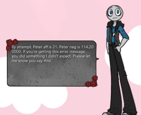 I keep getting the "Ily attempt, Peter aff is 21 , Peter neg is 114.20000. if you're getting this error message, you did something i didn't expect, PLease let me know you say this" … I mayyy have hit him like 100 times- and then switched up on him and now its saying this ^^'