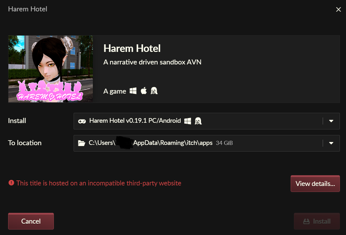 Seems Itch App does not allow downloading from third party sites. Error message is “This title is hosted on an incompatible third-party website”. Game can be downloaded manually from the Download links on game Itch page.