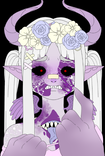 Lilly: -dark purple splotches apeared on her face and her eyes were a redish grey-  w-e   st-stay-y?