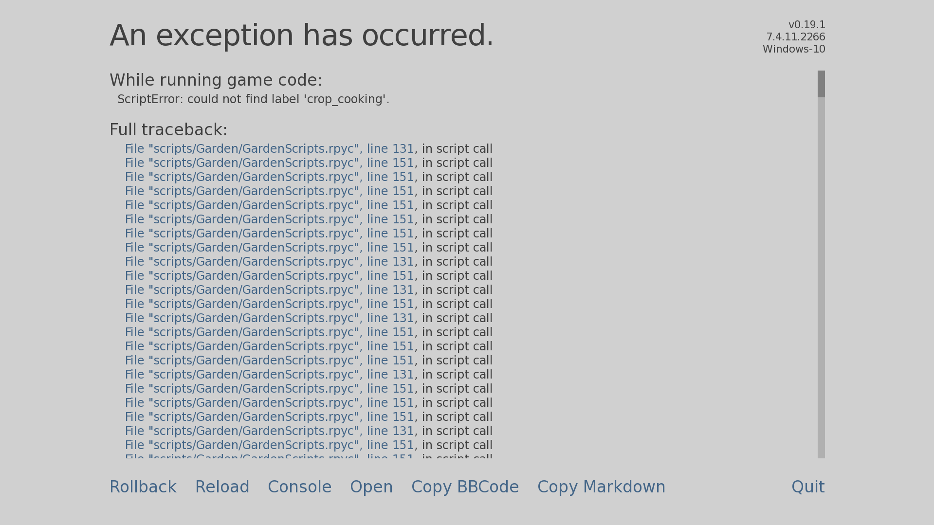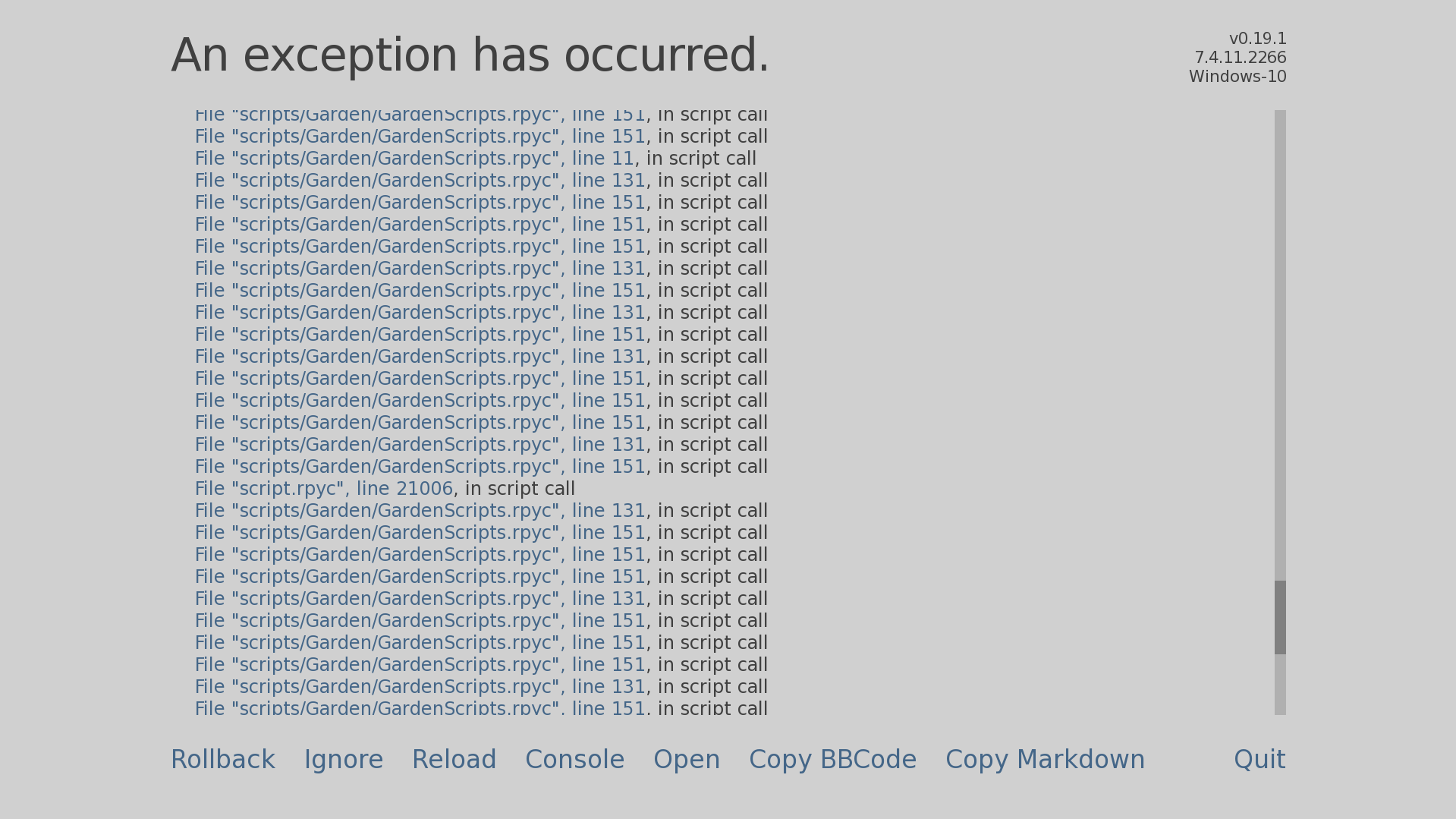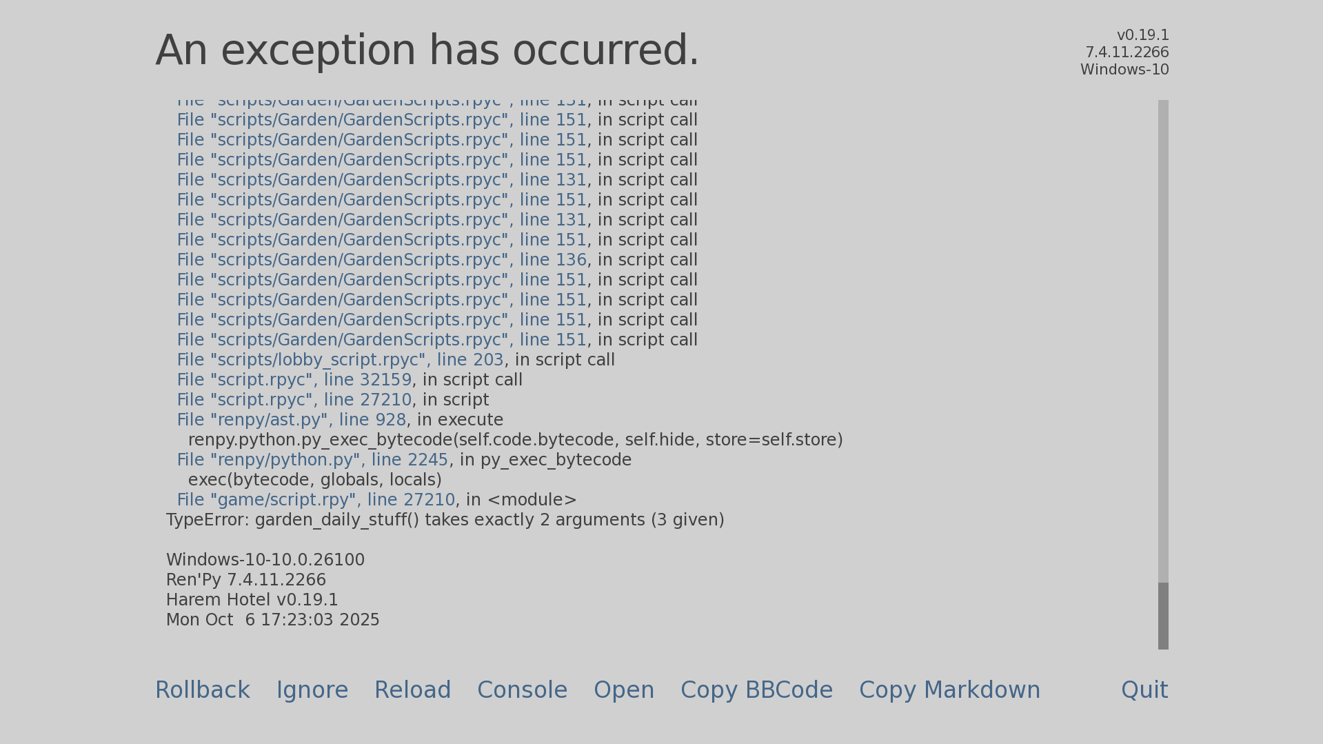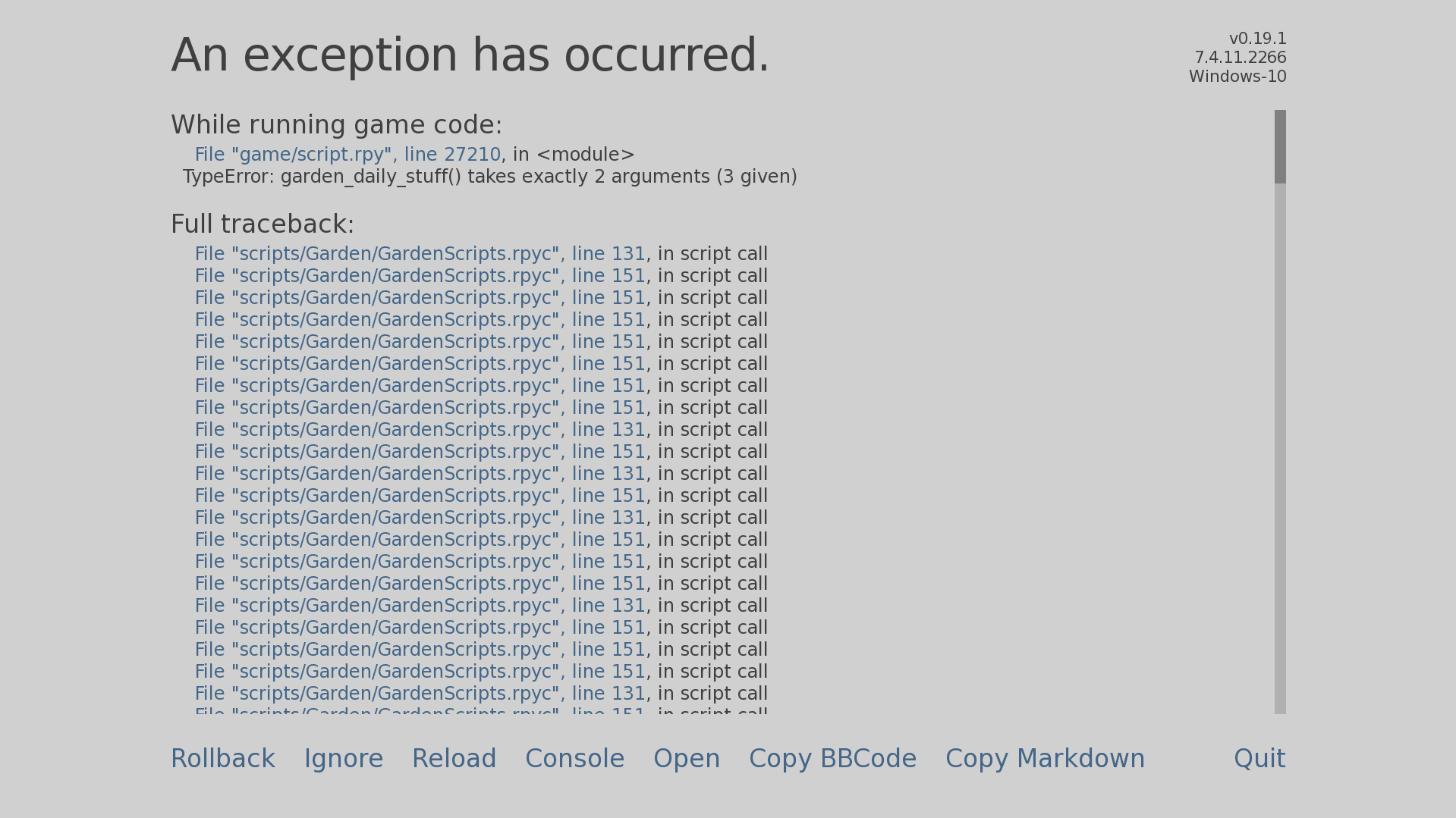 edit: it just occured to me to see if it's my file that somehow got fcked, so i started a new game. a new day still shows the exception page. the full traceback list is a lot shorter, but they're all about gardening