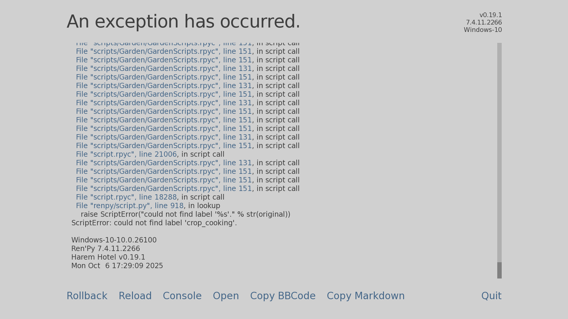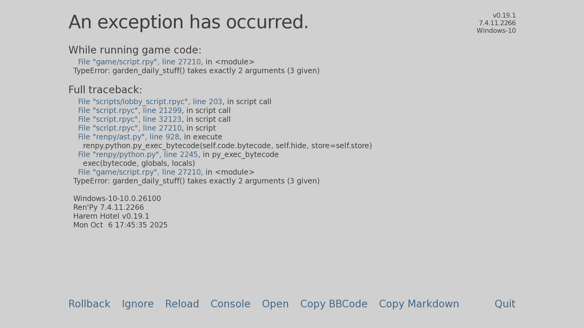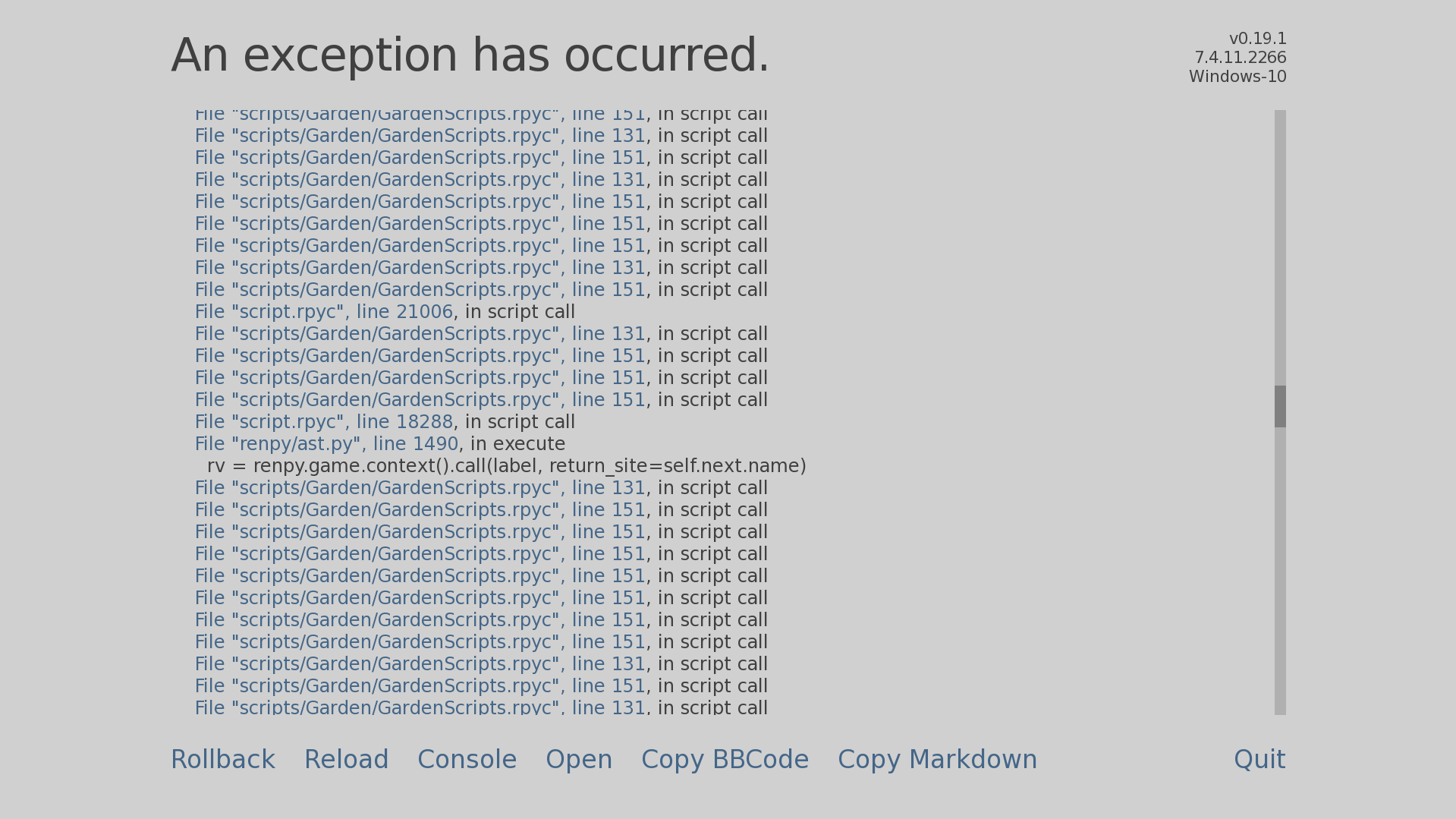 edit: it just occured to me to see if it's my file that somehow got fcked, so i started a new game. a new day still shows the exception page. the full traceback list is a lot shorter, but they're all about gardening