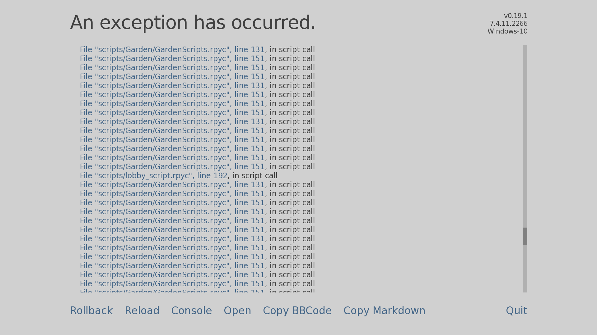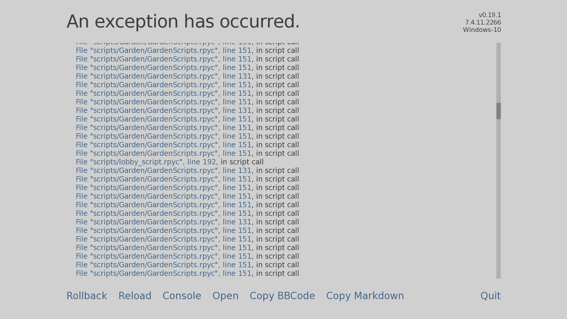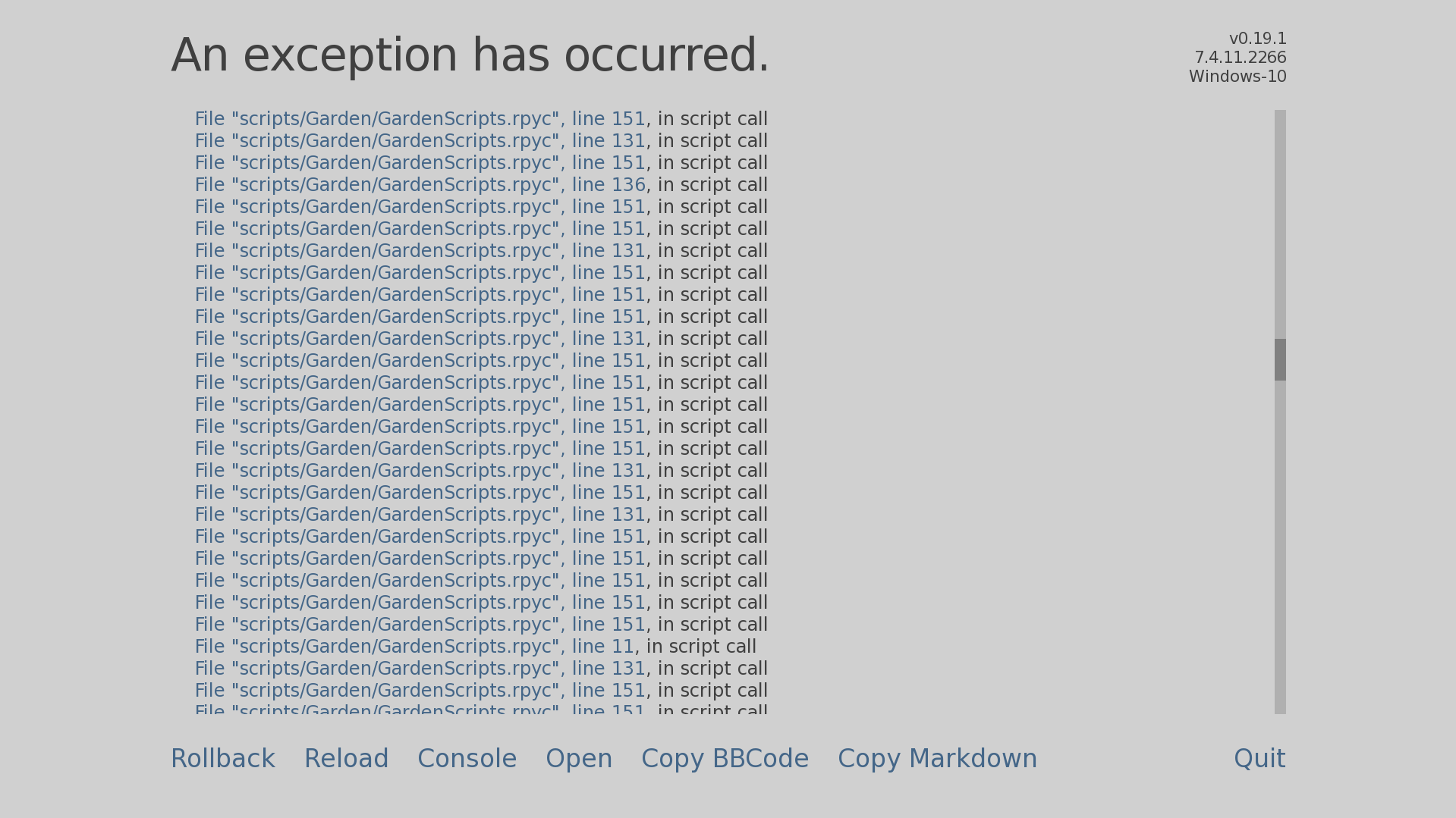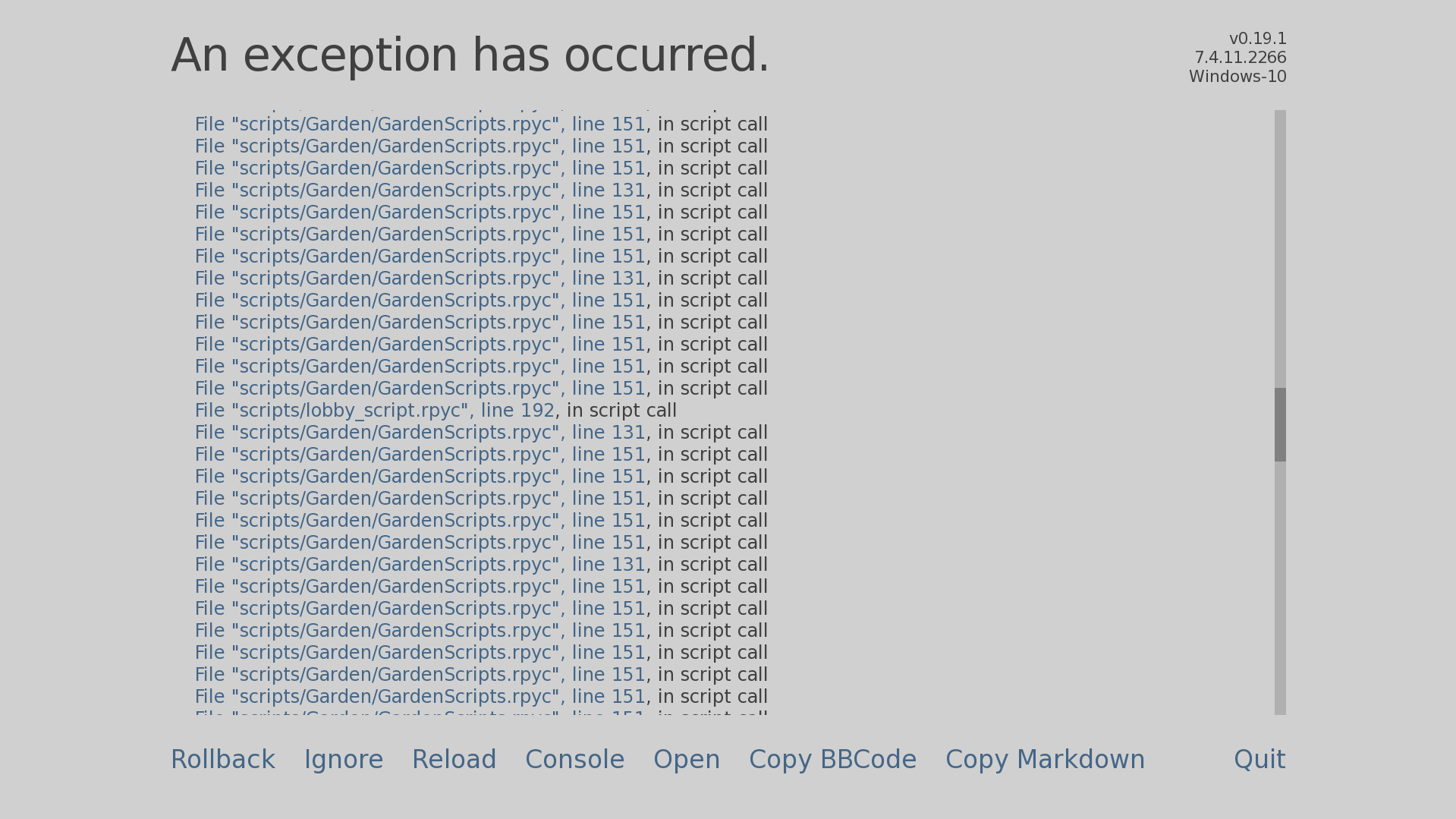 edit: it just occured to me to see if it's my file that somehow got fcked, so i started a new game. a new day still shows the exception page. the full traceback list is a lot shorter, but they're all about gardening