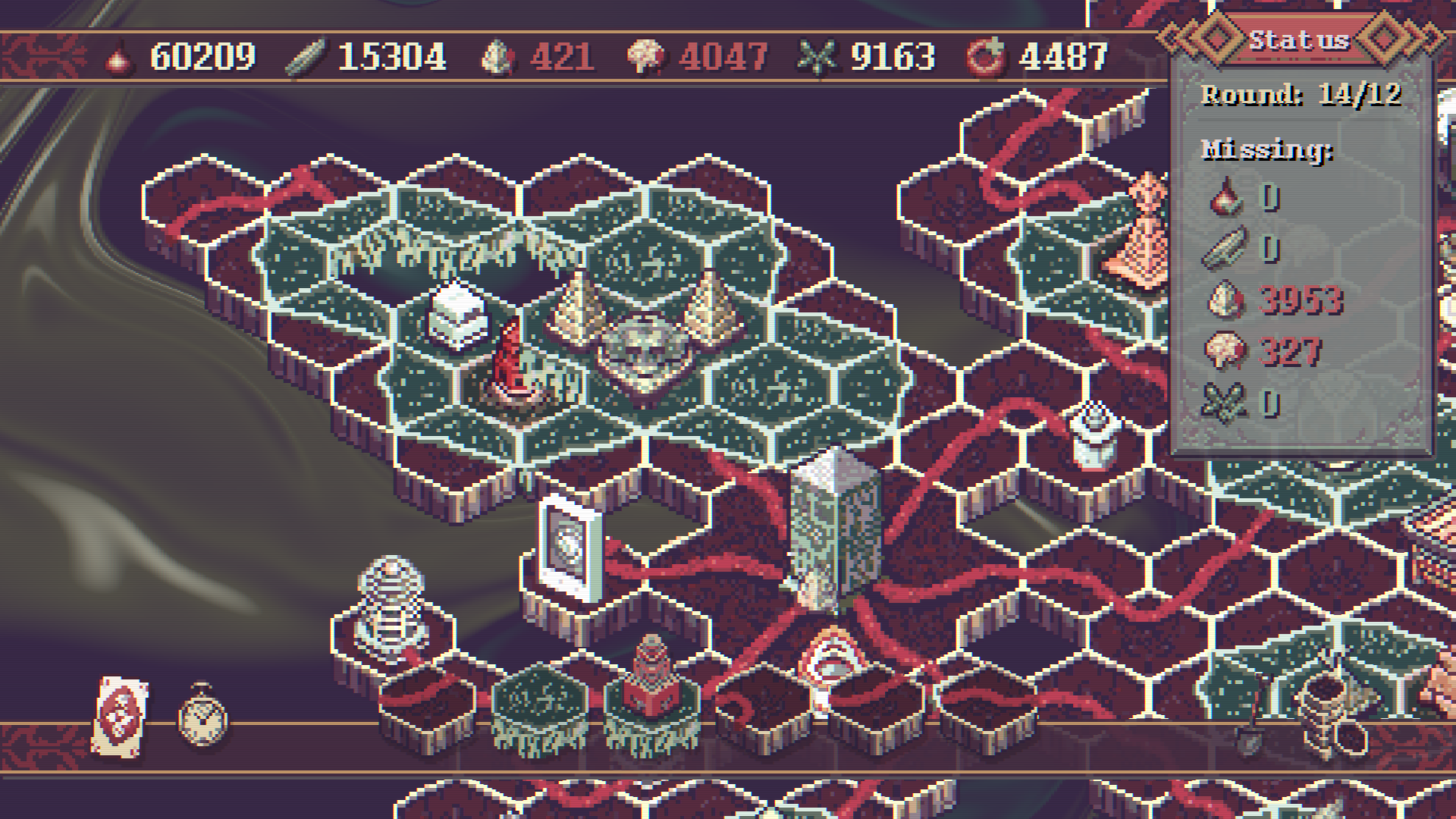Wow, you got pretty far. I haven't had many rounds that went this far, so I don't know how (im-)balanced the game gets as you go further. Well played! The visual bug with the ribbits (and factory) is one that existed since the start of the project and has something to do with Godots TileMapLayer. I don't know how to fix it, because almost nobody uses such a tile system. It doesn't affect the gameplay anyway. I will try to add something that makes the 3rd resource production easier in the later rounds. (They have no official name on purpose!). Currently I am also experimenting with the a shuffle mechanic. Instead of the shuffle button, you right click a tile to put it at the end of the deck, for the cost of 1 6th resource. In this way, the hotbar feels and works more like an "inventory" for the player. Generally I am trying to improve the user experience, as it seems like some things keep players from playing. The game doesn't get much attention. I'm glad I have at least one "pro" at my game, haha. As you know the game quite well now, if you have any cool ideas, let me know and I might implement them.