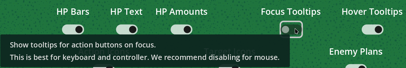For the tooltips, you can temporarily hide them by holding Shift. You can permanently turn them off in the Settings, on the Gameplay tab. We recommend turning off the Focus Tooltips for mouse, and using the Hover Tooltips, though you can adjust them for your preferences. We left both on by default to ensure the details were shown no matter the input method used, as we've found that in jams many people won't look at the settings before starting, especially if they don't understand or enjoy the game enough on initially playing. We will think on it a bit more, with a favoring toward mouse and touch in our defaults in the future, as that is likely the most commonly to be used.