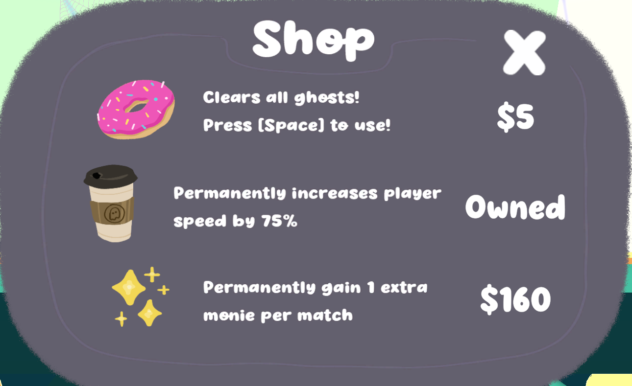 Really fun game, I played until a point I turned invincible lol, after unlock the speed upgrade, I stopped to read the descriptions of each ghost and I only would set them to random ghosts until one of them be a match. Never accumulate more than 3 ghosts using this strategy. As you can see, I played for some time, since I have upgraded the gain monie per match. The upgrades costs firstly 5, then 10 - 20 - 40 - 80 - 160. Well, addicting game as you can see lol, congrats for that! Visuals and music are really cozy and good.