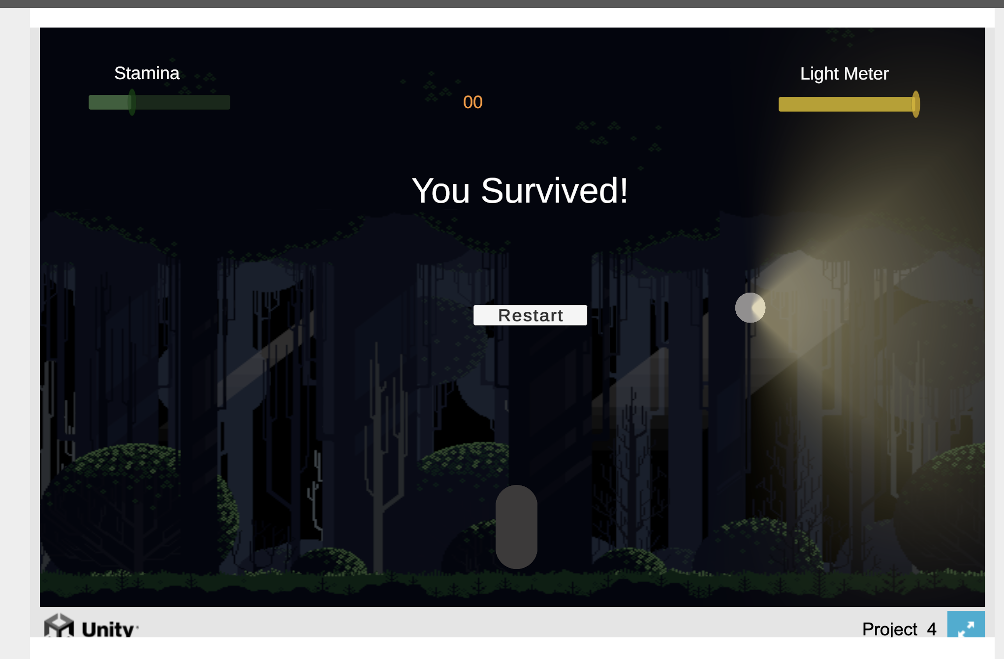I do like the resource management of both the player's ability to escape and the comfort of the lighting. Though the parallax scrolling might be going too fast, it feels like the player is running in a circle instead of to the right.
