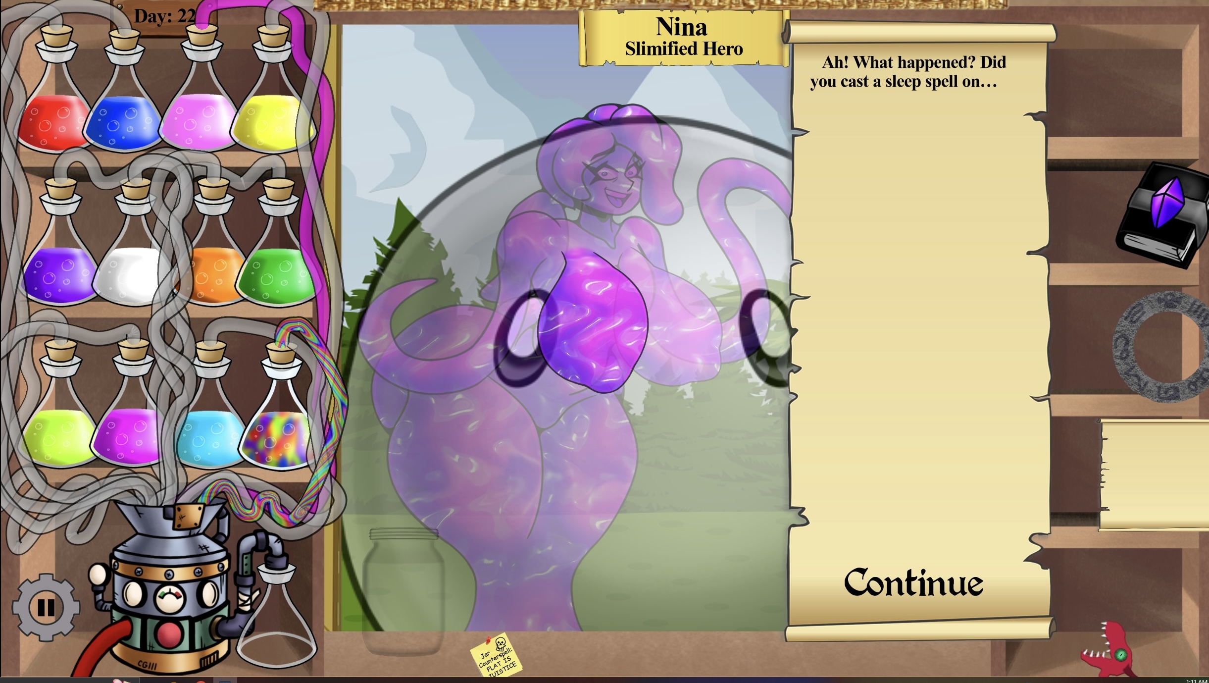 I found a glitch on day 22 during the slime attack if you use the concentrated slime extract on the Nina statue, once you survive attack and when Big Jed (great name for him by the way) jumps into view, Nina suddenly turn into her slime form, not only causing her dialogue to her game over to take priority over Gritta killing Jed so he’s just stuck there. But it all causes this weird visual glitch with Nina looking like inside of Jed except for her left boob for some reason. here’s a pic on what it looks like.