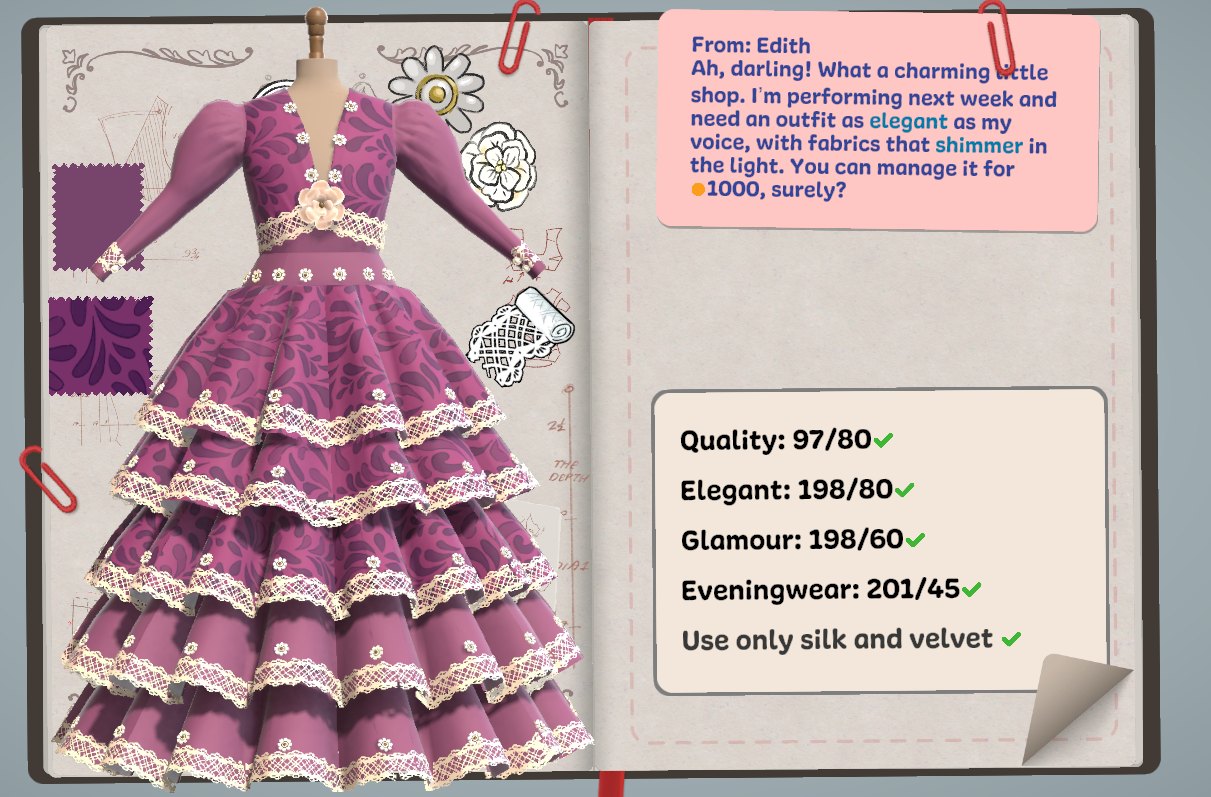 I absolutely love this game, but GOD, are the camera controls annoying. I love getting to design the dresses, but sometimes I was scrapping pennies together making them. Flat broke almost the entirety of the game. The final dress is the one I love the most and spent the most cash on.