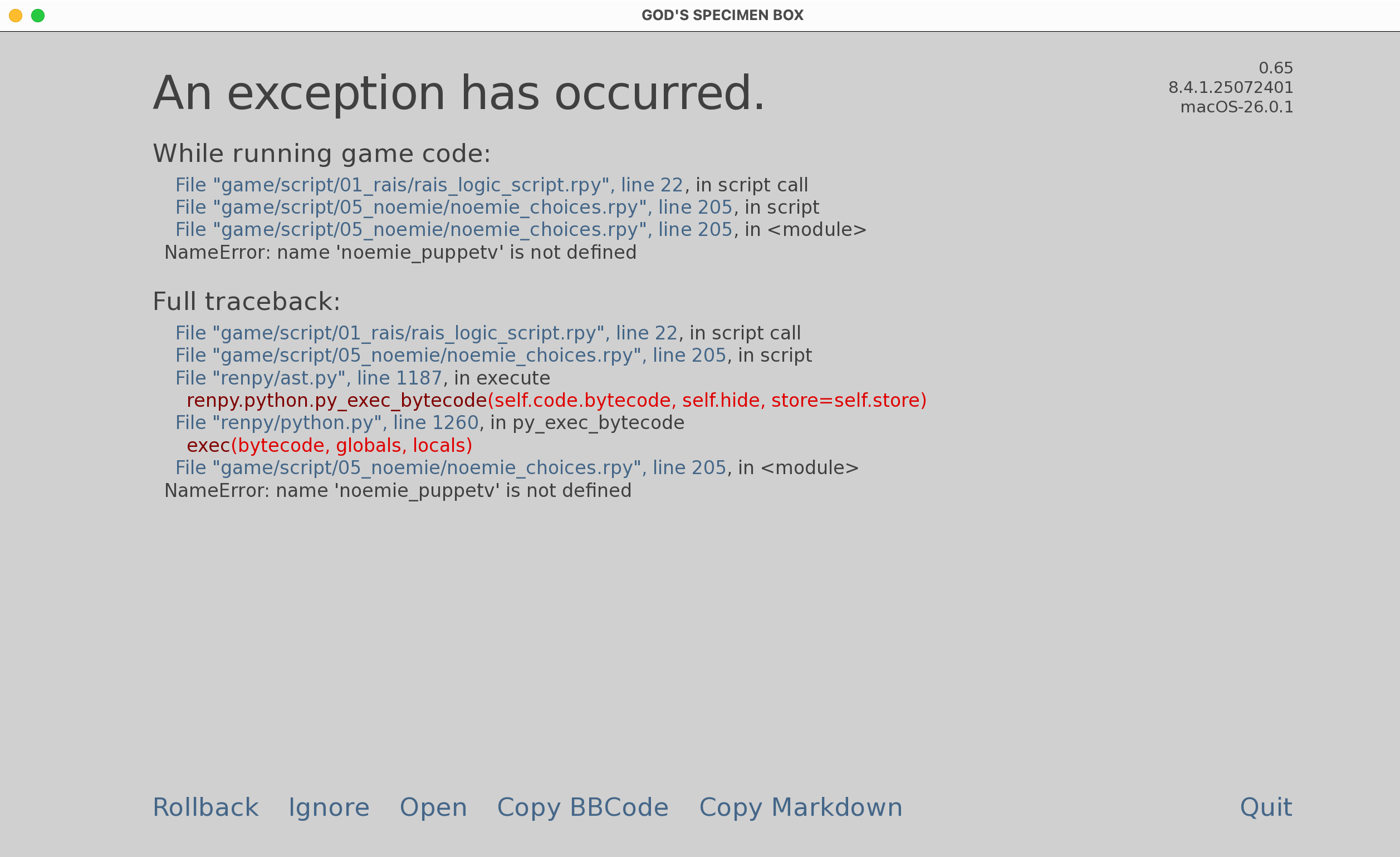 I'm currently playing this game right now and its very intriguing. However, there are some bugs on the last lock on Noeme where both options lead to an error that states the following: