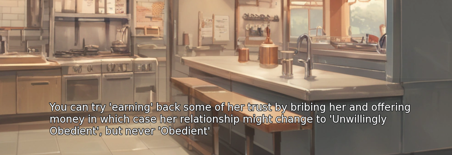 You may have overlooked the game's narration. About the Yoru’s relationship, I think you chose the red color option 'Approach her threateningly' when you talk to her, then the relationship changed to Apprehensive, you can change it to Unwillingly Obedient by offering money, but never Obedient. So if you wanna change it to Obedient, I think you should choose the other option.