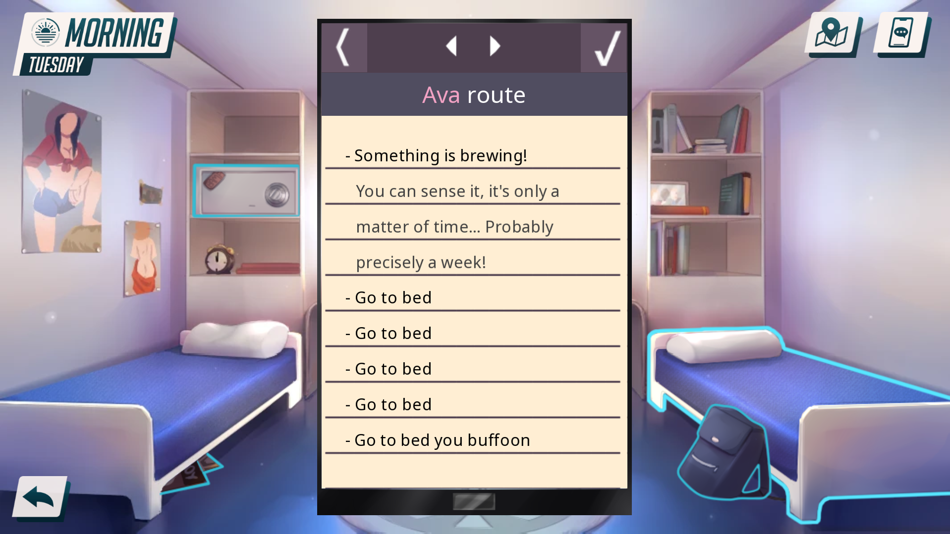 and finally i dont know why but i have a feeling the game wants me to go to bed in order to advance Ava's story...but im not sure can you help me out here? XD