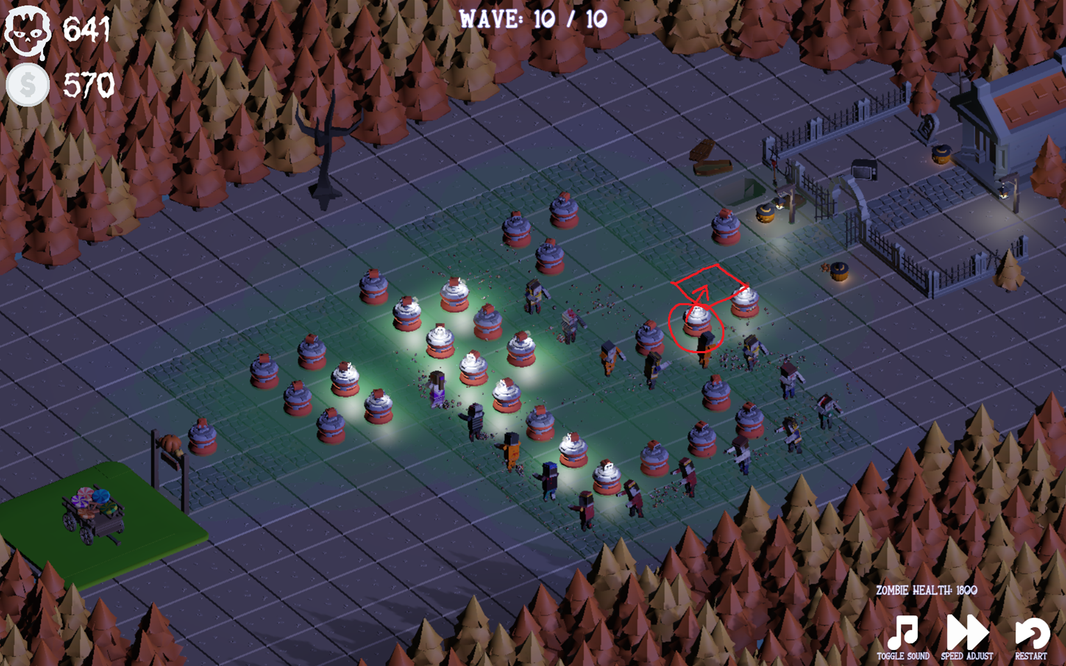 The music is very fitting, it reminds you of thriller. One thing that’s bugging me is that before purchasing the range upgrade, the tower in the red circle below can’t reach the tile diagonal to it.