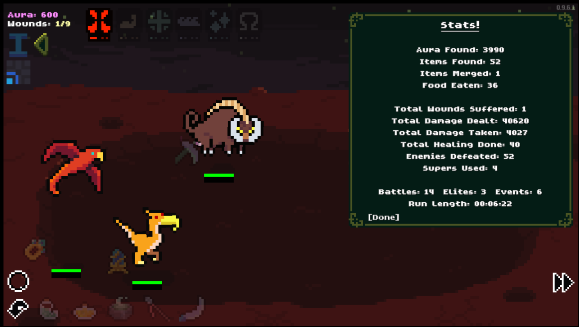 The way the strategy works is taking the lowest hp monster in the game: pyris (nessa doesn't work bc of its egg form making it truly useless in every aspect of the game EXCEPT for the 99999 hp on a monster run a guy completed a bit ago) is the one and only monster I start off with, I dont pick two. Then I prayed I can live for long enough to get a stick effigy (this took several rerolls until I got lucky). After getting the stick effigy I blitz through the game because every battle takes much shorter since the enemies just have to kill pyris and I don't get any wounds because of haunted synergy. In the meantime I collect everything I need for the targoth battle like decent items, some good eggs and enough aurite shards to level them all up and hey presto. I get to targoth with a solid team. If you are very astute you will notice I did 16 battles but have 19 wounds. How is this possible? The simple explanation is that there is a little trick to save a few seconds where you hatch and evolve your monsters while moving to the next path. It may seem like a small thing but between 6 evolutions and 2 hatches, this trick saves a sizeable amount of time. this is a VERY unoptimized run and there are ways to get a MUCH lower time.