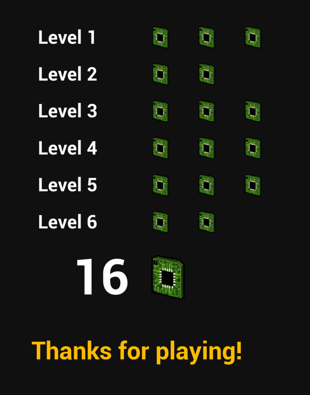 Cute game! The square friction mechanic is really fun, and I liked the physics, walking animation, and the puzzles — all nicely done. I finished the game, though I didn’t manage to collect all the processors.