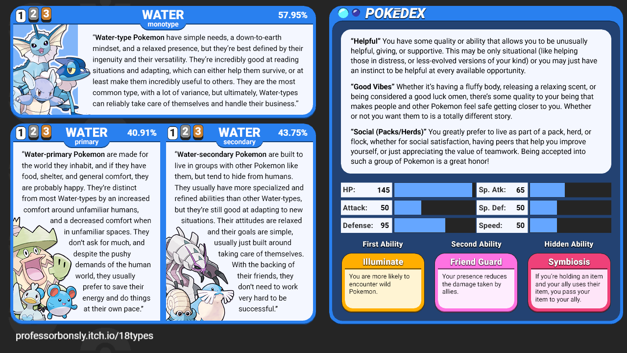 And great question about the stats! So originally, these were a somewhat-silly side thing that I included as a little extra inspiration for people who wanted to make a pokemon out of themselves, but there's still thought put into them.  They're largely fueled by the attribute scores (like "helpful", "good vibes" etc) but with a few extra bonuses derived from the certain answers to specific questions. They're not actually calculated as a number, but rather as a percentage, so that everyone who takes this test gets a stat total of 450, give or take 10 pts from rounding shenanigans. I picked that number because it's the stat total of Piloswine, which could either be considered a final evolution or a middle evolution, depending on what game it's in. Potential room for growth, or potential final form, depending on how you want to look at it, but definitely not a baby!
