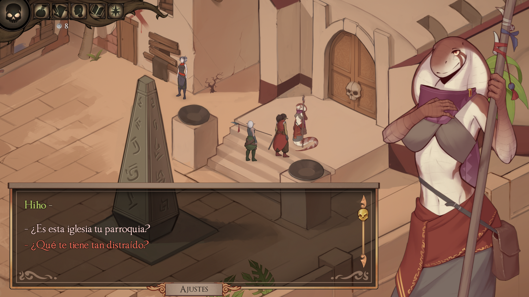Sorry to bother you, I don't speak English so I translated this with Google Translate. I tried to put the game in Spanish, but in several places there's a bug where the text doesn't display. For example, Hiho's description is invisible (the description of what Hiho looks like), and the same goes for several NPCs, but this is only in gray text and their responses aren't visible. I'm sorry if I shouldn't have posted about the bug here. It's an excellent novel.