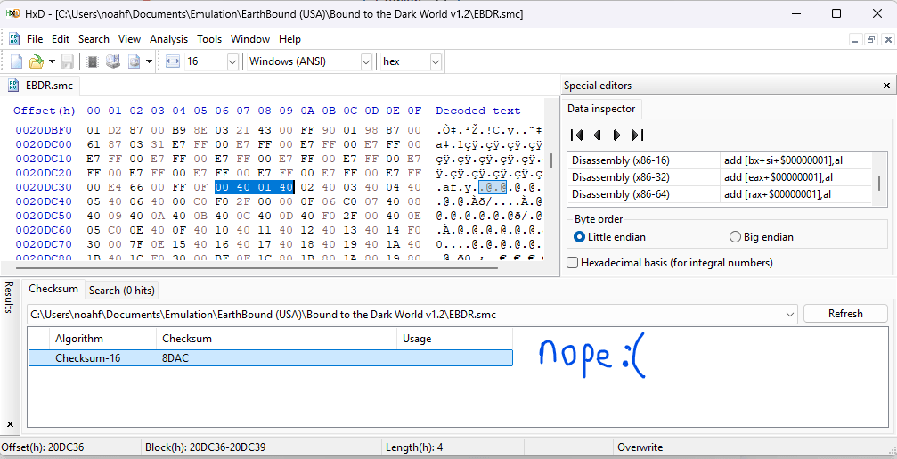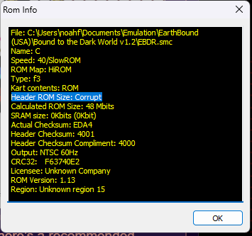 I've also taken the time to attempt to fix these issues manually by means of Hex Editing and IpsAndSum to fix the checksum error that shows in SNES9x, but neither solution seems to have fixed the "Header ROM Size: Corrupt" and "[bad checksum]" lines in the rom info.