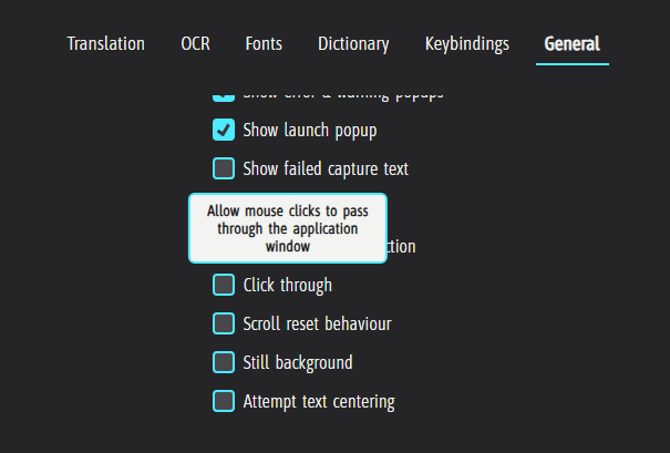 However I've tried that setting and it does allow me to click things on screen with the translation window over it but when I click and drag, it still moves the translation overlay. It occurs in all launch modes, Desktop, Attached, and Internal. I'm using Windows 10 if that matters. No worries if it's not currently possible. Take care and good luck with whatever you have going on.