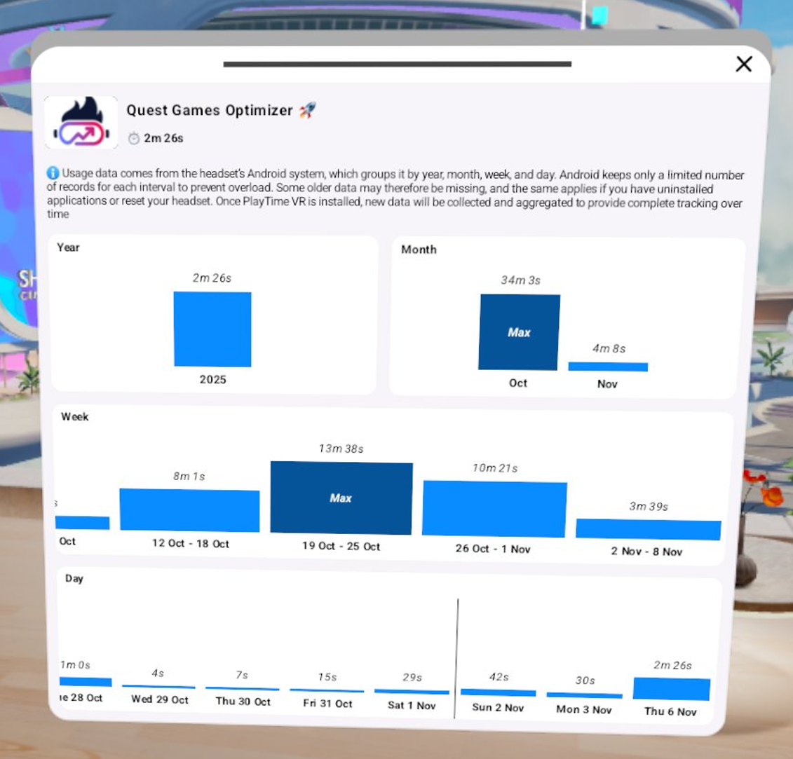 i noticed an issue today with the playtime overall time. the total time isn't showing up correctly. the total time and year time is now showing up as the same value as the playtime for just today. see attach photo as an example with qgo time log. i'm seeing the same issue for other apps/games that i open up today as well. right now, i have history log up to the 10th of october, which is about 28 days. not sure if there is a bug when the history log passes 4 weeks of data?