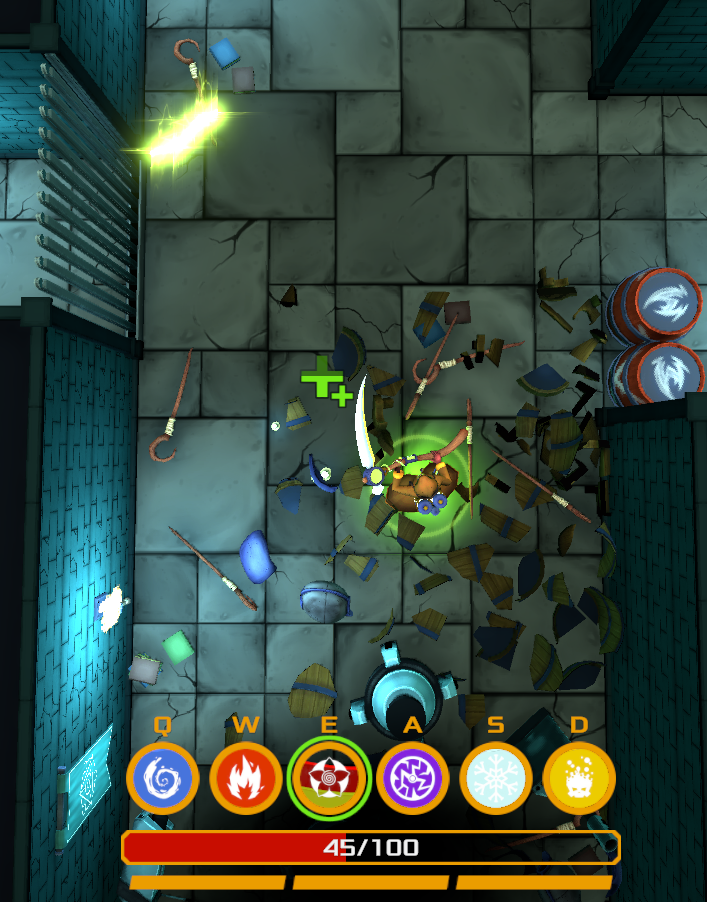 The new tutorial is an improvement since it's shorter and has some enemies to fight. First room has this green static effect that loops forever, Alt-tabbing pauses music as it should but torches still animate and the element bars refill. I feel like the circular robot should have a cap on how many henchmen it can spawn so the player can clear out all of those before fighting that one. Might want to update the shop so that hovering the mouse over something pops up the item description so the player doesn't have to walk over there multiple times.