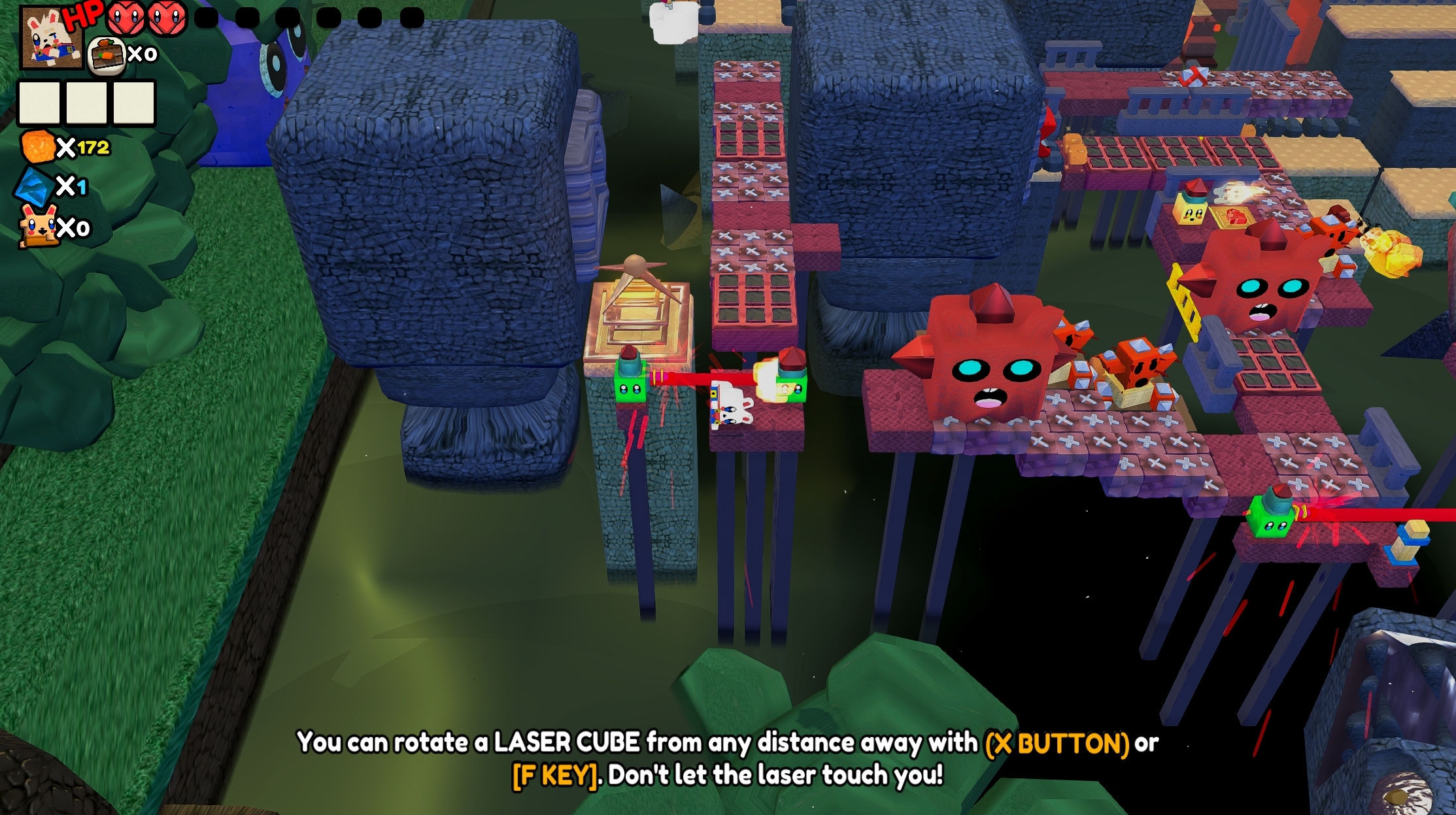 6) Added a laser introduction to the desert temple level so the player will know to burn ghosts with lasers. The prompt for this in the areas where the laser is used is large and explains the rotation can be done at any distance away from the cube.